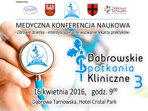 Minął już rok od poprzednich spotkań klinicznych organizowanych w Dąbrowie Tarnowskiej. Zgodnie z założeniami nasze kwietniowe spotkania stają się cykliczne, będą odbywały się w każdą trzecią sobotę kwietnia. Od tego roku organizatorem Dąbrowskich Spotkań Klinicznych jest nowo powstała Fundacja Troska i Wiedza Powiśla Dąbrowskiego. Współorganizatorami III DSK są Urząd Miejski w Dąbrowie Tarnowskiej, Starostwo Powiatowe oraz Stowarzyszenie Wspierania Wiedzy Medycznej w Rybniku. Tegoroczne III Dąbrowskie Spotkania Kliniczne poświęcone zostaną w całości problematyce szeroko pojętego „zdrowia dziecka”. Janusz Korczak powiedział: „Śmieje się tylko zdrowe dziecko”, dlatego wszyscy, nie tylko lekarze musimy starać się aby na twarzach wszystkich dzieci gościł uśmiech. Celem tej, dorocznej już, konferencji jest zawiązanie ścisłej współpracy pomiędzy lekarzami różnych specjalności praktykujących w ambulatoriach, przychodniach, szpitalach oraz osób pracujących w szkołach i poradniach z wybitnymi pracownikami naukowymi i klinicznymi wiodących ośrodków akademickich w Polsce. III Dąbrowskie Spotkania Kliniczne, odbędą się 16 kwietnia 2016 r. od godz. 9:00 w Hotelu Cristal Park**** w Dąbrowie Tarnowskiej. Szczegóły na www.dsk.org.pl . Czytaj dalej
