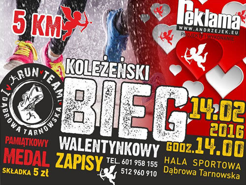 Dąbrowska grupa entuzjastów biegania z Amatorskiej Drużyny Sportowej Run Team Dąbrowa Tarnowska już dziś zaprasza na Walentynkowy Bieg / Trening. Bieg, który odbędzie się w Dzień Św. Walentego – 14 lutego br. – będzie miał charakter koleżeński, bez numerów startowych i bez pomiaru czasu. Robimy to co najbardziej lubimy czyli biegamy. Bieg rozpoczynamy 14 lutego o 14:00 spod Hali Sportowej im. Agaty Mróz – Olszewskiej. Organizatorzy informują, że mają ograniczoną ilość miejsc (50) dlatego, proszą o wcześniejsze zapisy na swojej podstronie – jak to w biegu „kto pierwszy ten lepszy”. Dla każdego uczestnika przewidziany pamiątkowy medal, oraz poczęstunek po zakończonym biegu. Zapraszamy wszystkich chętnych razem z dziećmi. Zagwarantowana będzie opieka na pociechami w czasie gdy zdyszani rodzice pokonywać będą 5 km trasę Biegu Walentynkowego. Czytaj dalej