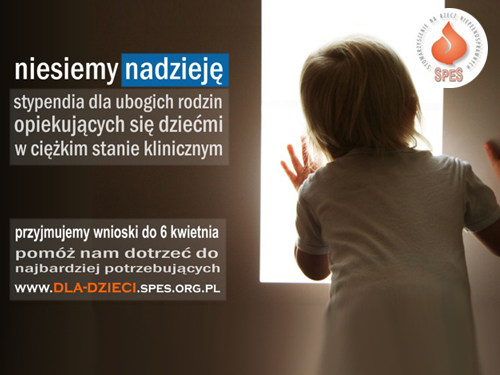 Rodziny znajdujące się w trudnej sytuacji finansowej, opiekujące się dziećmi w ciężkim stanie klinicznym, mogą ubiegać się o stypendium Stowarzyszenia Na Rzecz Niepełnosprawnych SPES. Program Pomocy Dzieciom realizowany przez to stowarzyszenie jest skierowany do znajdujących się w trudnej sytuacji finansowej rodzin, opiekujących się dziećmi, które na skutek choroby lub wypadku znalazły się w ciężkim stanie klinicznym. Są to dzieci wymagające wsparcia funkcji życiowych za pomocą respiratora bądź koncentratora tlenu, karmienia dojelitowego lub pozajelitowego, a także innych całodobowych specjalistycznych zabiegów opiekuńczych i pielęgnacyjnych. Nabór wniosków o przyznanie stypendium trwa od 6 marca do 6 kwietnia br. Czytaj dalej