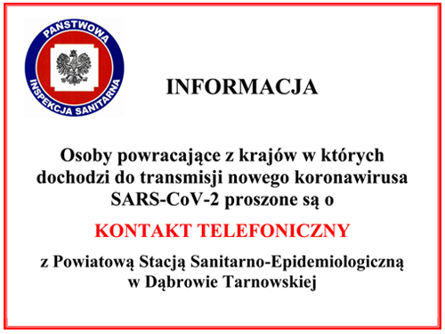 Państwowy Powiatowy Inspektor Sanitarny w Dąbrowie Tarnowskiej zwraca się z gorącym apelem, aby osoby powracające z krajów, w których dochodzi do transmisji nowego koronawirusa SARS-CoV-2 kontaktowały się telefonicznie z najbliższą placówką Sanepidu. W przypadku Powiatu Dąbrowskiego jest to Stacja Sanitarno-Epidemiologiczna w Dąbrowie Tarnowskiej dostępna pod numerami telefonów: od godziny 7:30 do godziny: 15:00 - tel.: 14 642 25 71, tel.: 14 642 23 96, tel.: 14 648 20 17; od godziny 15:00 do godziny: 7:30 - tel. alarmowy: 603 767 937;