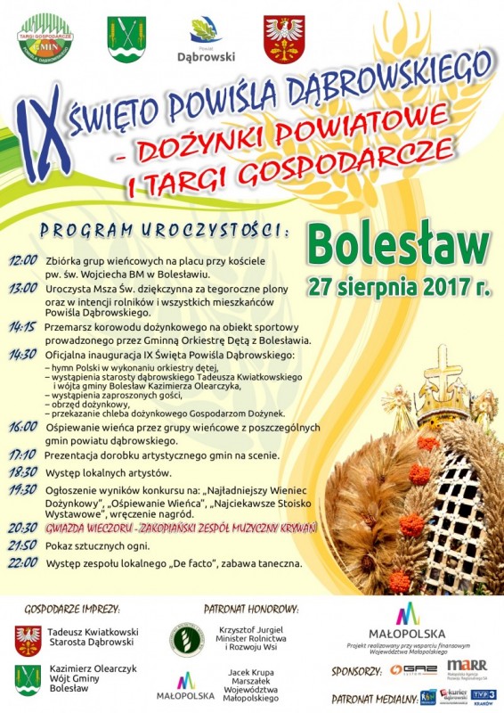 Symbolicznym zwieńczeniem zebranych plonów będą tradycyjne wieńce dożynkowe przynoszone podczas Mszy Świętej jako dar ołtarza. Tym gestem rolnicy naszego powiatu będą wyrażać wdzięczność za udane zbiory i dar chleba. Zgodnie z tradycją, zaprezentują się również przedsiębiorcy, zarówno z regionu jak i całego województwa małopolskiego. W ramach współpracy międzynarodowej powiatu, swoje stoiska wystawią również przedsiębiorcy z Węgier, Niemiec, Mołdawii i Ukrainy.