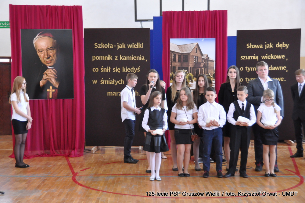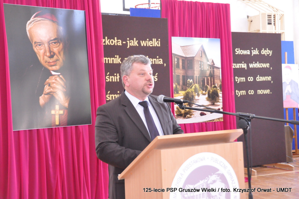 wygłosił przemówienie będące rysem historycznym oświaty w Gruszowie Wielkim, której początki sięgają roku 1891. W długoletniej historii szkolnictwa w tej miejscowości podkreślił najważniejsze wydarzenia, instytucje i osoby, dzięki którym istnieje szkoła w obecnym kształcie. Zwrócił uwagę na starania zmierzające do wybrania przez Szkołę patrona, których uwieńczeniem było Nadanie Szkole Imienia Kardynała Stefana Wyszyńskiego 10 października 2011 roku. Pan dyrektor skierował słowa podziękowania do władz gminnych, oświatowych, byłych dyrektorów Szkoły Podstawowej, jej byłych i obecnych nauczycieli oraz rodziców, których wsparcie i działania na rzecz oświaty są nieocenione.
