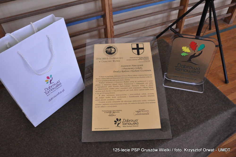 Uroczystość swoim wystąpieniem uświetnił Burmistrz Dąbrowy Tarnowskiej Krzysztof Kaczmarski, który podkreślił doniosłą rolę Szkoły w środowisku lokalnym, zwrócił uwagę na rozwój placówki odpowiadający wymogom obecnych czasów. Nie zapomniał też o tych, którzy zapisali piękne karty 125-letniej historii Szkoły Podstawowej w Gruszowie Wielkim.