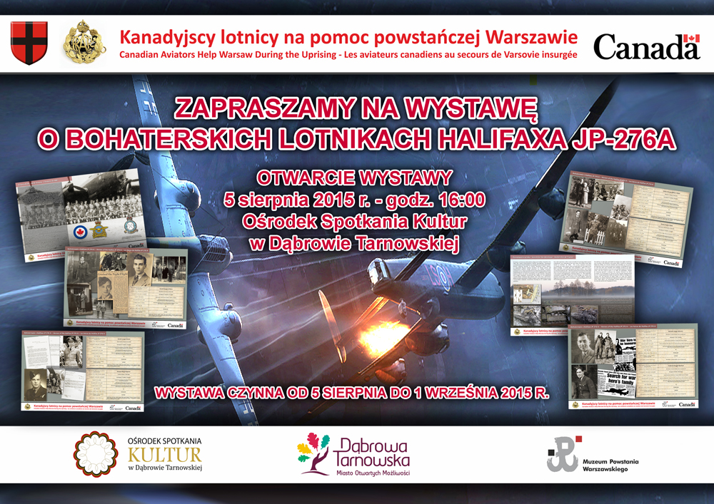 W środę 5 sierpnia br. Dąbrowa Tarnowska uczci załogę samolotu Halifax JP 276 A okolicznościową wystawą w Ośrodku Spotkania Kultur i apelem poległych pod pomnikiem poległych lotników na cmentarzu parafialnym. Otwarcie wystawy zaplanowano na godz. 16:00, a apel poległych na godz. 17:00. Z okazji tych uroczystości nasze miasto gościć będzie przedstawiciela Ambasady Kanady w Polsce. Wystawa „Kanadyjscy lotnicy na pomoc powstańczej Warszawie” przedstawia historię ostatniego lotu Halifaxa JP 276 A, zestrzelonego przez Niemców nad Dąbrową Tarnowską w nocy z 4 na 5 sierpnia 1944 roku oraz żmudną pracę specjalistów z Muzeum Powstania Warszawskiego nad identyfikacją szczątków samolotu oraz jej załogi kilkadziesiąt lat później. Wystawę  przygotowała Ambasada Kanady we współpracy z Dr Piotrem Śliwowskim – Kierownikiem Działu Historycznego Muzeum Powstania Warszawskiego.