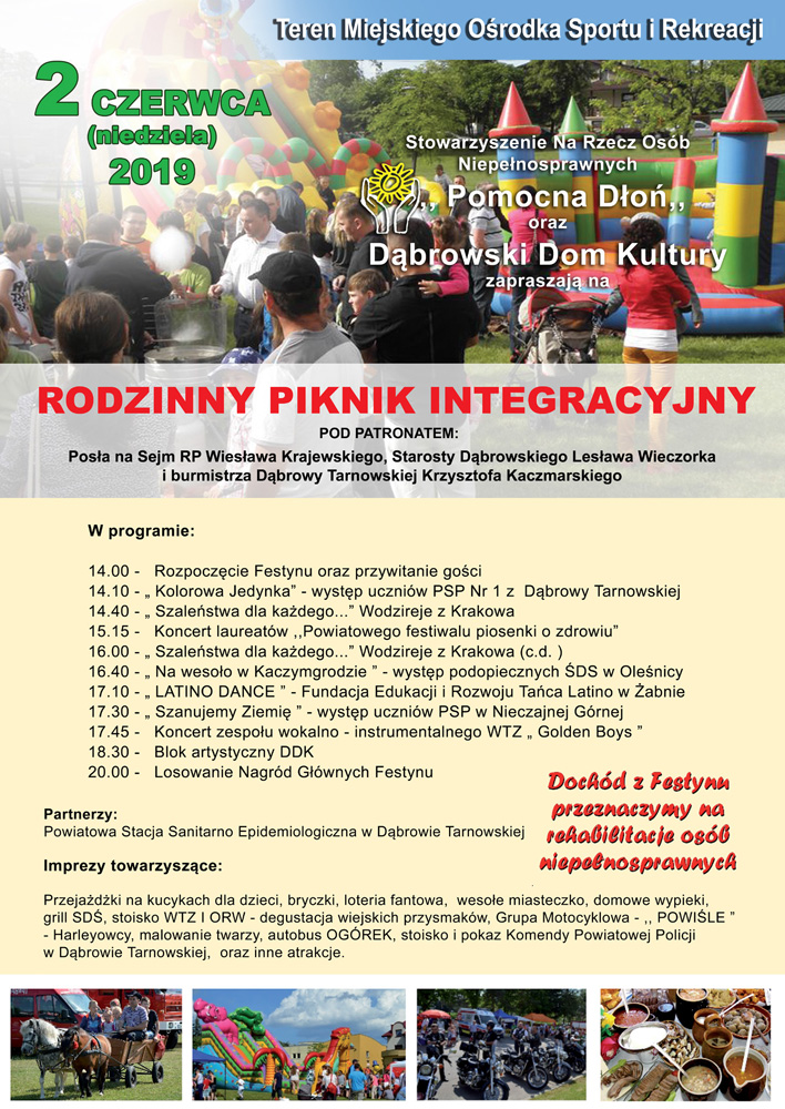 Już w najbliższą niedzielę, 2 czerwca br., Stowarzyszenie na Rzecz Osób Niepełnosprawnych „Pomocna Dłoń” oraz Dąbrowski Dom Kultury zapraszają na Rodzinny Piknik Integracyjny pod patronatem Posła na Sejm RP Wiesława Krajewskiego, Starosty Dąbrowskiego Lesława Wieczorka oraz Burmistrza Dąbrowy Tarnowskiej Krzysztofa Kaczmarskiego. Piknik, tak jak w poprzednich latach odbędzie się na terenie Centrum Konferencyjno-Sportowego przy ul. Sportowej 4 w Dąbrowie Tarnowskiej. Rozpoczęcie zaplanowano na godz. 14:00. W programie imprezy przewidziano występy uczniów gminnych szkół oraz przedstawienie teatralne podopiecznych Środowiskowego Domu Samopomocy w Oleśnicy, tańce i konkursy, dużo smacznego jedzenia, grill, losowanie. Doświadczeni organizatorzy zapewniają wspaniałą rodzinną atmosferę. Dochód z pikniku zostanie przeznaczony na rehabilitację osób niepełnosprawnych. Serdecznie zapraszamy do wspólnej zabawy i pomocy podopiecznym Stowarzyszenia na Rzecz Osób Niepełnosprawnych „Pomocna Dłoń”.
