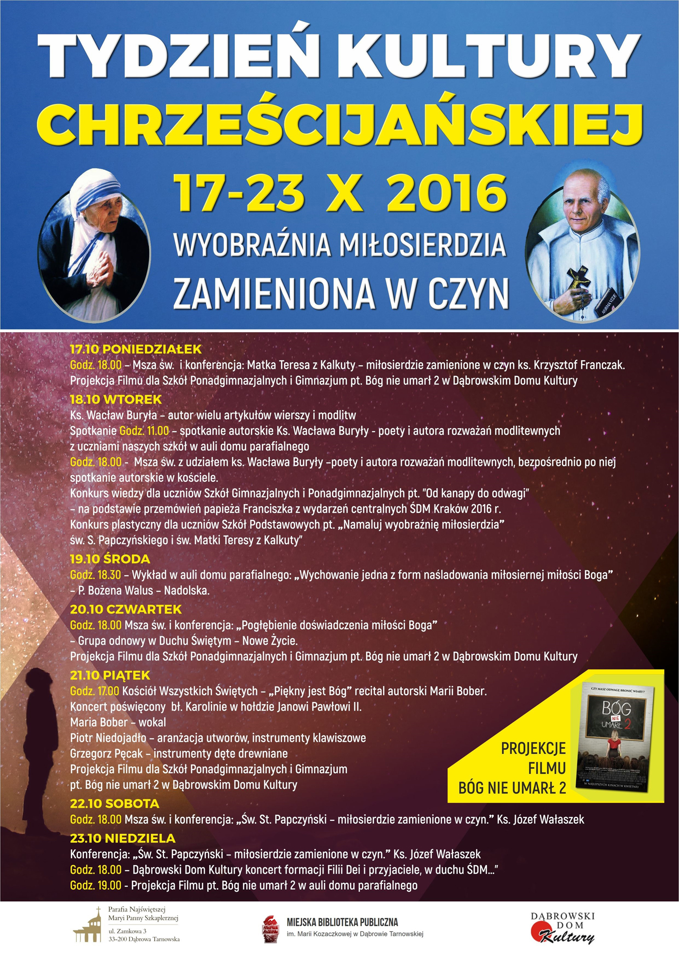 Tydzień Kultury Chrześcijańskiej (TKC) będzie miał swoje odzwierciedlenie w wielu dziedzinach sztuki, w tym w muzyce, poezji i filmie. Już we wtorek 18 października zorganizowane zostaną dwa spotkania autorskie z ks. Wacławem Buryłą, poetą i autorem rozważań modlitewnych oraz Msza Św. w Kościele pw. NMP Szkaplerznej o godz. 18:00 z jego udziałem. Spotkania te odbędą się w ramach projektu „Z gwiazdami zaczytani” realizowanego przez Miejską Bibliotekę Publiczną w Dąbrowie Tarnowskiej. Piątkowe popołudnie 21 października TCK upłynie pod znakiem muzyki poświeconej bł. Karolinie w hołdzie Janowi Pawłowi II. Z recitalem pt. "Piękny jest Bóg" w Starym Kościele o godz. 17:00 wystąpi artystka Maria Bober, której akompaniować będą Piotr Niedajadło i Grzegorz Pęcak. Warta uwagi jest także propozycja filmowa TKC „Bóg nie umarł 2”. Uczniowie szkół gimnazjalnych i ponadgimnazjalnych będą mieli okazję zobaczyć ten obraz w Dąbrowskim Domy Kultury. Dla wszystkich innych parafian zostanie zorganizowana projekcja filmu w Auli Domu Parafialnego w niedzielę o godz. 19:00.
