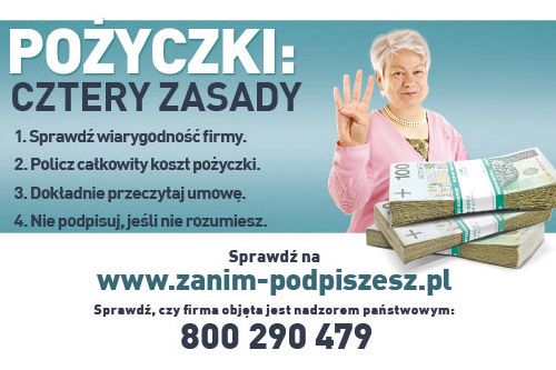 W związku z tym prowadzona jest kolejna część akcji społecznej „Nie daj się nabrać. Sprawdź, zanim podpiszesz!”, współorganizowana przez siedem instytucji publicznych: Bankowy Fundusz Gwarancyjny, Komisję Nadzoru Finansowego, Ministerstwo Finansów, Ministerstwo Sprawiedliwości, Narodowy Bank Polski, Policję oraz Urząd Ochrony Konkurencji i Konsumentów.
