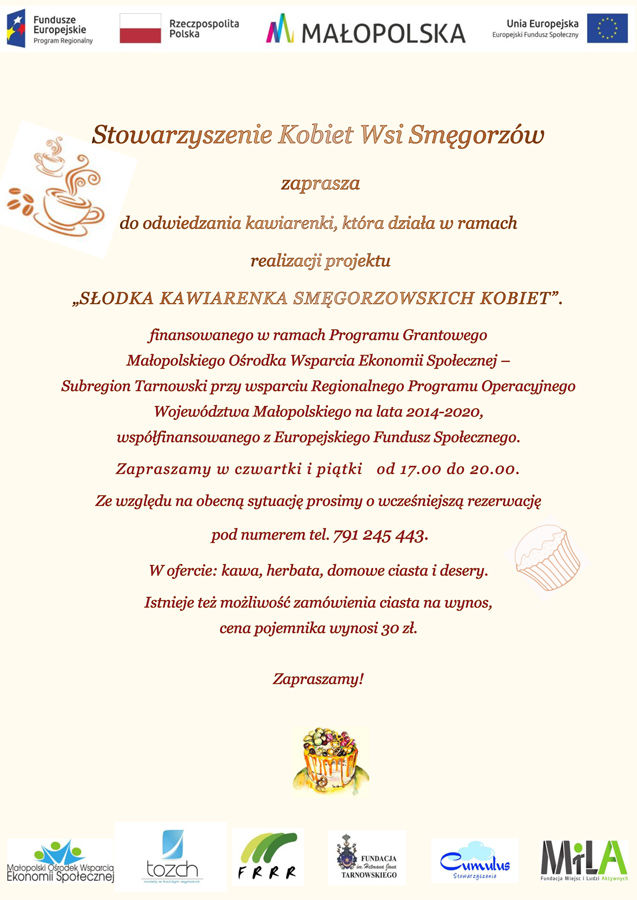 Stowarzyszenie Kobiet Wsi Smęgorzów zaprasza na degustację ciast organizowaną w ramach zadnia „Kawiarenka smęgorzowskich kobiet” Projekt realizowany jest w ramach Programu Grantowego Małopolskiego Ośrodka Wsparcia Ekonomii Społecznej– Subregion Tarnowski, przy wsparciu Regionalnego Programu Operacyjnego Województwa Małopolskiego na lata 2014-2020, współfinansowanego z Europejskiego Funduszu Społecznego.