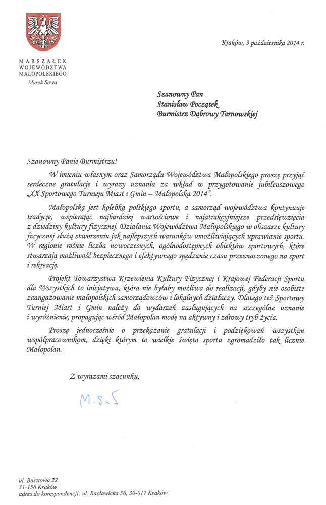 List gratulacyjny M Sowa 2014 Kolejne wyróżnienia dla Gminy Dąbrowa Tarnowska za działalność sportowo   rekreacyjną
