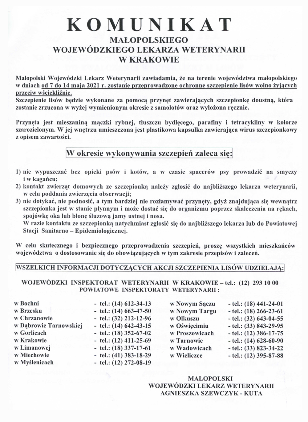 Małopolski Wojewódzki Lekarz Weterynarii w Krakowie informuje, że w dniach od 7 do 14 maja 2021 roku na terenie województwa małopolskiego zostanie przeprowadzona akcja szczepienia lisów wolno żyjących przeciwko wściekliźnie. Szczepienie lisów będzie wykonane za pomocą przynęt zawierających szczepionkę doustną, która zostanie zrzucona z samolotów oraz wyłożona ręcznie w wyżej wymienionym okresie.