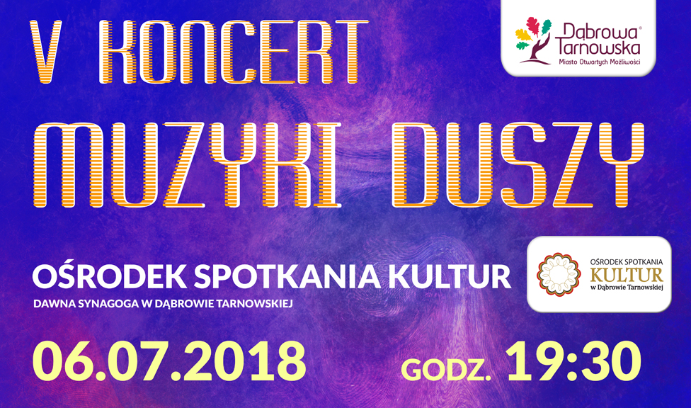V Koncert Muzyki Duszy to niezwykle klimatyczna i nastrojowa uczta duchowa w wykonaniu młodych, zdolnych muzyków i wokalistów związanych ze sceną DDK. W tym roku przebiegać będzie pod kierunkiem literackim poezji Zbigniewa Herberta (dobór tekstów – Lucyna i Paweł Chojnowscy, recytacja – Julia Tatarczuch i Mateusz Minor). Reżyserem i twórcą aranżacji muzycznych jest Łukasz Chmiel, dźwięku – Mariusz Budzik („Sonic”). Koncert odbędzie się w malowniczych wnętrzach dawnej sali modłów dąbrowskiej synagogi (Ośrodek Spotkania Kultur), a dźwięki gitar, pianina, delikatnych instrumentów perkusyjnych i piękno głosów uzupełni gra kolorów i zapadających ciemności nocy.