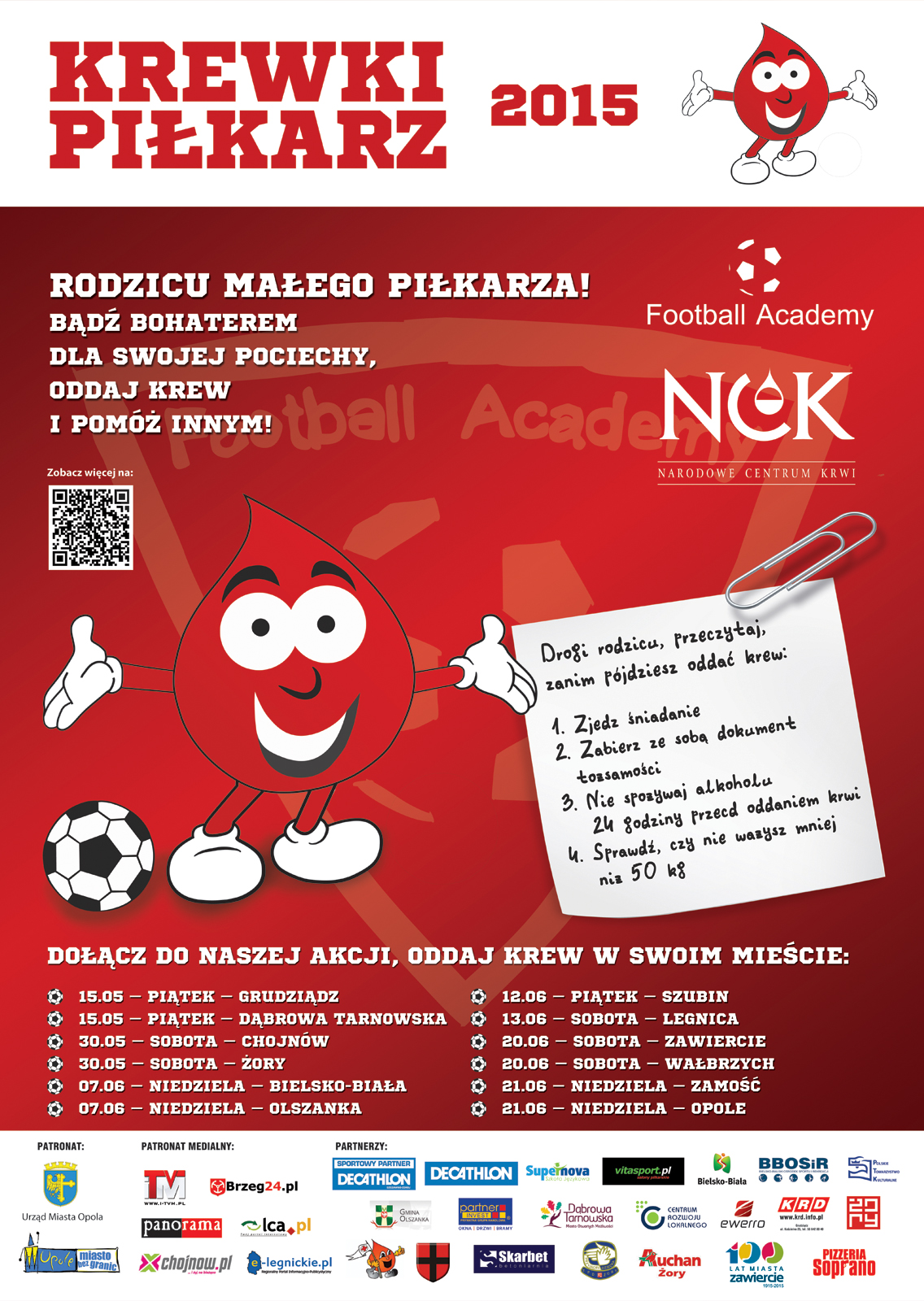 Fundacja Football Academy już po raz drugi realizuje ogólnopolski projekt pod nazwą "Krewki Piłkarz". To przedsięwzięcie, którego nadrzędnym celem jest podnoszenie świadomości społecznej w zakresie krwiodawstwa oraz zachęcanie ludzi do oddawania krwi podczas specjalnych wydarzeń – akcji zbiórki krwi - organizowanych we współpracy z Narodowym Centrum Krwi oraz Regionalnymi Centrami Krwiodawstwa i Krwiolecznictwa. W tym roku – 15 maja w piątek od godziny 10.00 do 15.00 – na parkingu przy Urzędzie Miejskim w Dąbrowie Tarnowskiej stacjonował będzie KRWIOBUS z Regionalnego Centrum Krwiodawstwa z Krakowa, w którym będzie można oddawać krew tak bardzo potrzebna zwłaszcza w okresie letnim. Akcja oddawania krwi w Dąbrowie Tarnowskiej organizowana jest przez Football Academy i Urząd Miejski w Dąbrowie Tarnowskiej pod patronatem honorowym Burmistrza Dąbrowy Tarnowskiej. Bardzo prosimy i zachęcamy do aktywnego włączenia się w tą szlachetna inicjatywę. Rok temu Football Academy podczas akcji w całej Polsce zebrała około 150 litrów krwi. Tym razem organizatorzy chcą poprawić ten wynik. W tegorocznej akcji, która będzie się odbywać w majowe i czerwcowe weekendy bierze udział dwanaście polskich miast.