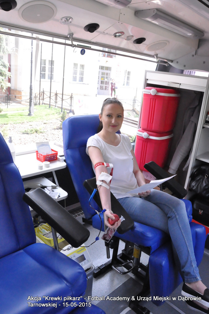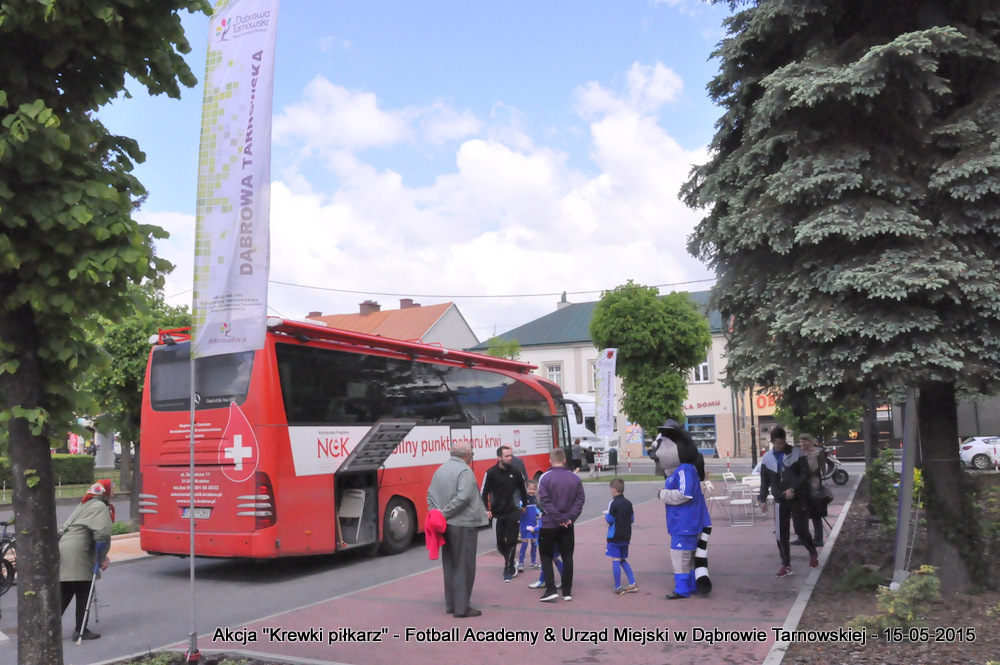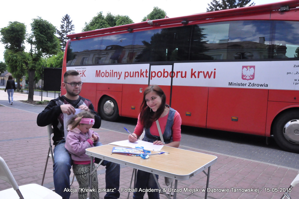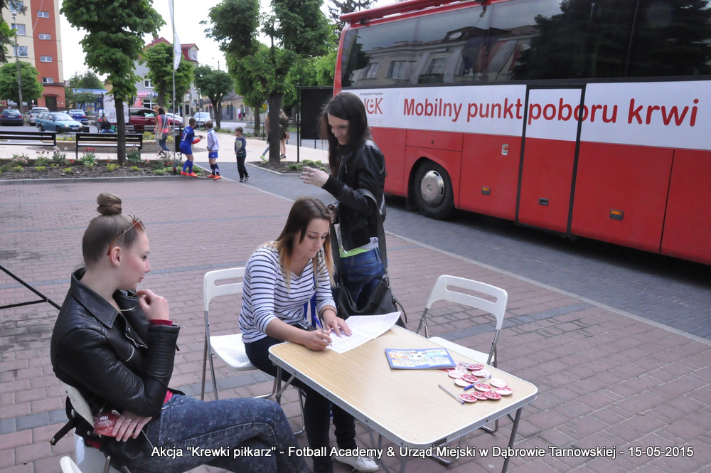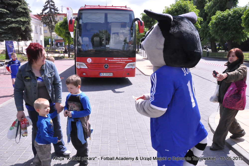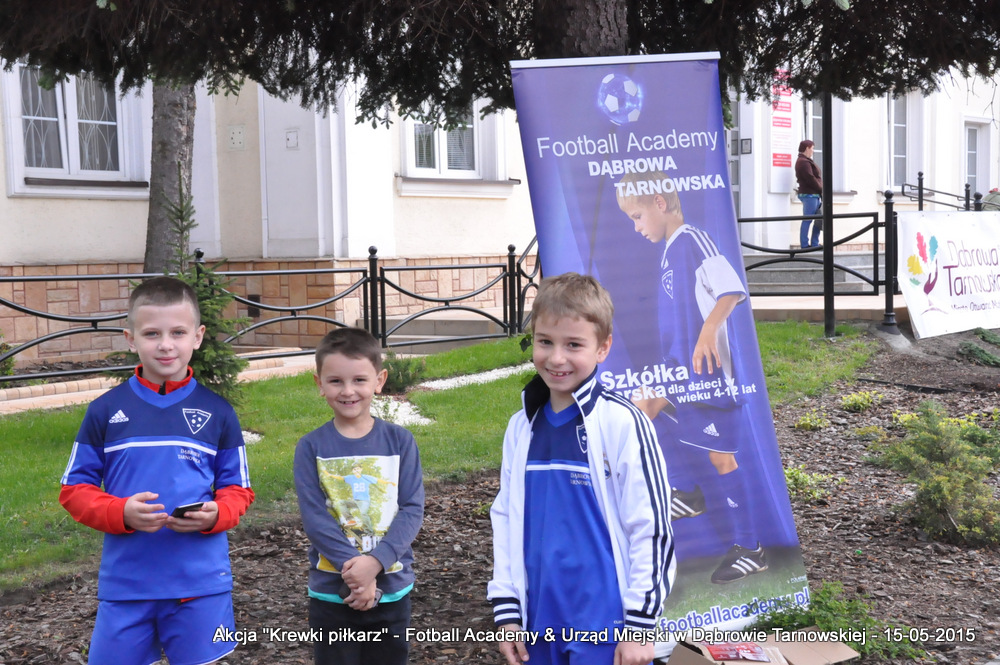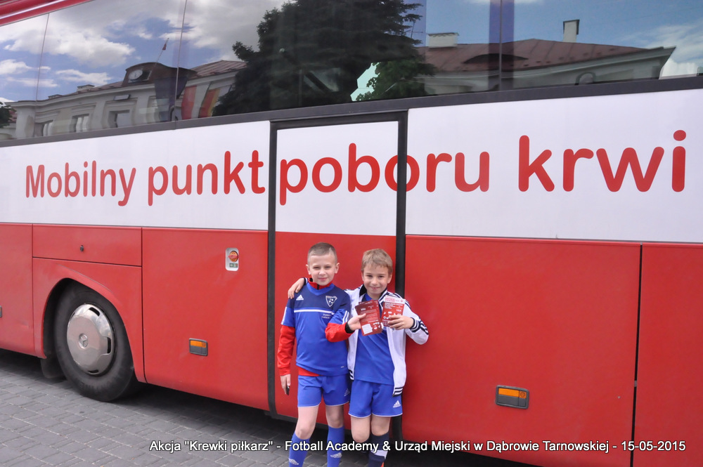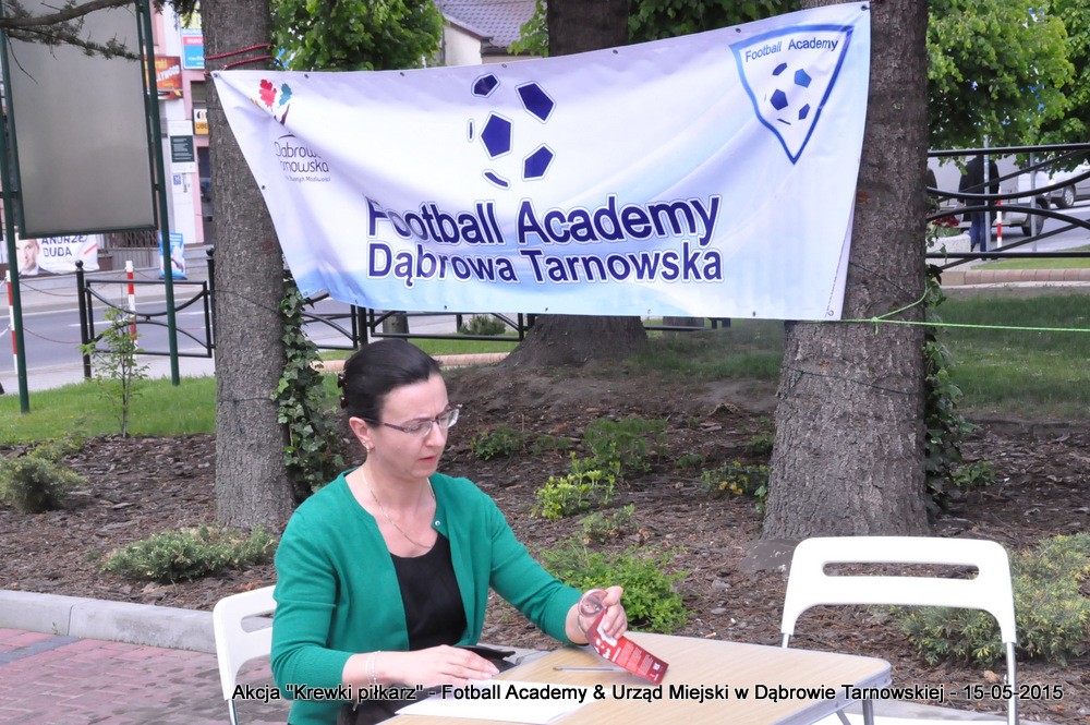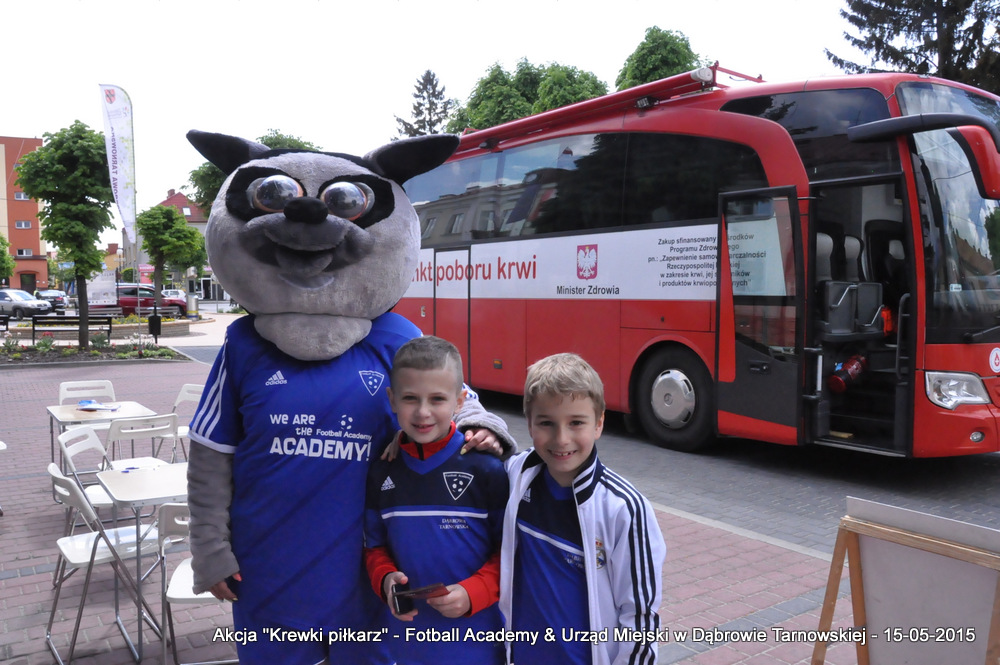15 maja 2015 odbyła się akcja oddawania krwi w ramach II  Ogólnopolskiej Edycji Projektu „KREWKI PIŁKARZ”. Organizatorem była Szkółka Piłkarska FOOTBALL ACADEMY i Urząd Miejski w Dąbrowie Tarnowskiej. Honorowym patronatem akcję zbiórki krwi objął Burmistrz Dąbrowy Tarnowskiej. W piątkowy słoneczny dzień zgłosiło się  blisko 50 chętnych osób do oddania krwi, jednak szczegółowe badania przeprowadzone przez Panią Doktor (Rygorystyczne wymogi zdrowotne) spowodowały, że 18 osób mogło oddać krew. Łącznie udało się zebrać ponad 8 litrów krwi – to duża i bezcenna ilość. Chyba nie ma nic bardziej satysfakcjonującego niż oddać cząstkę siebie, by uratować zdrowie i życie drugiej osoby. Dlatego tak cieszymy się z każdej zebranej jednostki krwi – każda z nich oznacza bowiem, że właśnie pomogliśmy ocalić jakiegoś konkretnego człowieka – czyjegoś ojca, czyjąś siostrę, czyjeś dziecko. Dziękujemy każdemu, kto przyłączył się do naszej akcji, oferując ten bezcenny dar serca.
