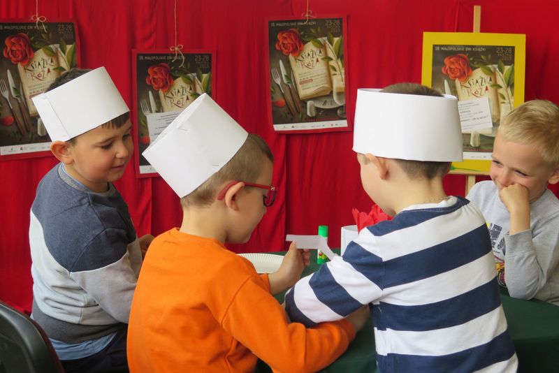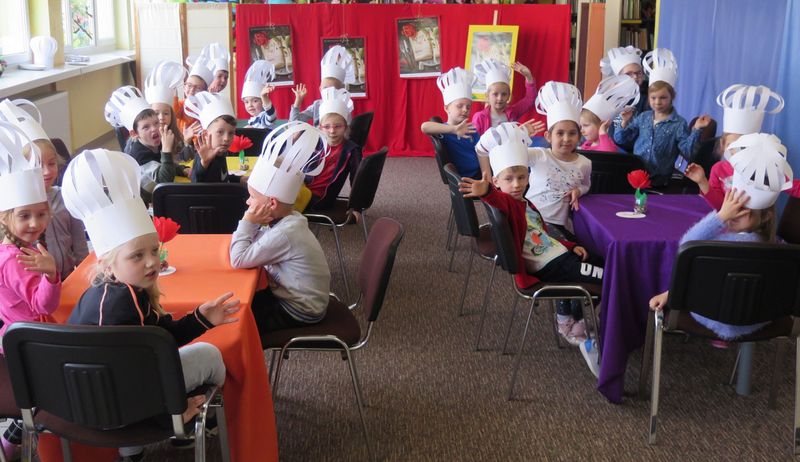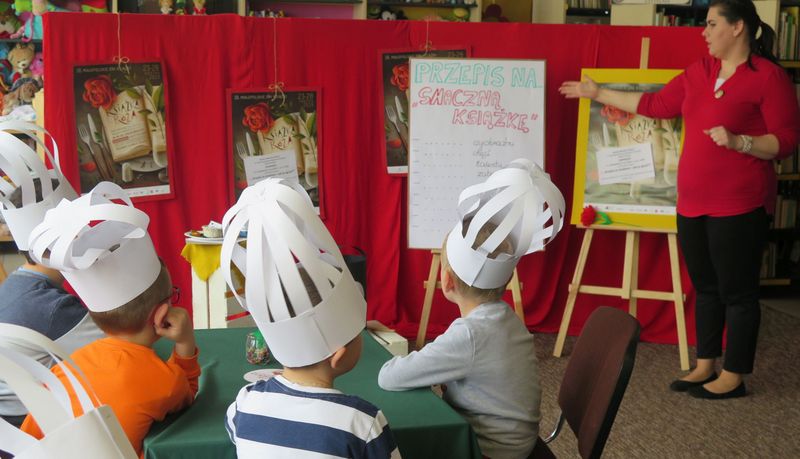 Oddział dla Dzieci Miejskiej Biblioteki Publicznej im. Marii Kozaczkowej w Dąbrowie Tarnowskiej wziął udział w XVIII edycji Małopolskich Dni Książki „Książka i Róża” obchodzonych w tym roku w dniach od 23 do 28 kwietnia. W ramach tej akcji można było dowiedzieć, jakimi „kucharzami” są smyki z grupy „Biedronki” z Publicznego Przedszkola nr 2 w Dąbrowie Tarnowskiej wspólnie przyrządzając przepis na „smaczną książkę”. Przedszkolacy odwiedzili Oddział dla Dzieci, aby w „Czytelniczej restauracji” zasmakować się w czterodaniowym menu składającym się z przystawki, czyli papierowych zawijańców, zupy w postaci bajkowego kociołka, dania głównego - kulinarnego czytadełka oraz z deseru, którym był dźwiękowy suflet. Mali szefowie restauracji projektowali kucharskie czapki potrzebne im do „ugotowania” zupy z nietypowych składników, takich jak wyobraźnia, zabawa czy szczypta chęci. Z kociołka „odcedzono” książkę pt. „Ugotuj mi bajkę” autorstwa Majdy Koren, której głośne czytanie uświadomiło zebranym, że każdy ma inne „smaki” czytelnicze…