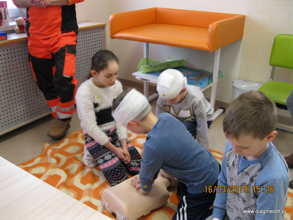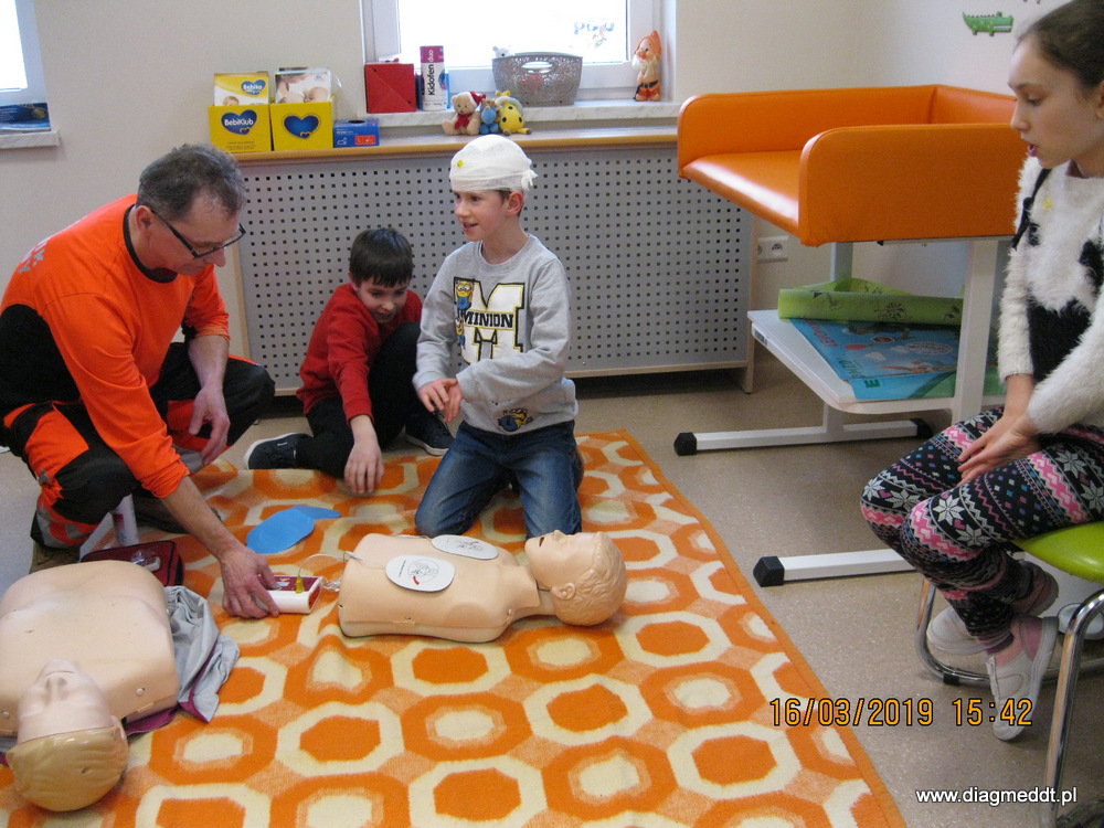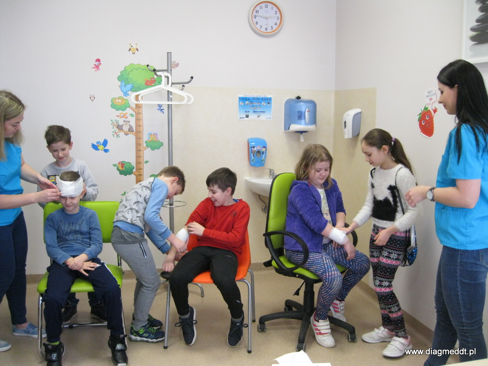 Dlatego w Naszej Przychodni 16 marca odbył się pierwszy „Kurs Małego Ratownika”. Jest to rozpoczęty przez nas cykl spotkań z dziećmi w różnej grupie wiekowej mający na celu poszerzenie wiedzy z zakresu pierwszej pomocy przedmedycznej. Szkolenie było przeprowadzone wśród dzieci w wieku 6 do 10 lat. Wzięło w nim udział 17 dzieci, które w trakcie zajęć podzielono na trzy grupy ćwiczeniowe. Każda grupa miała indywidualne ćwiczenia tematyczne w osobnych pomieszczeniach: wezwanie pomocy i pozycja bezpieczna, resuscytacja krążeniowo-oddechowa i obsługa AED oraz pierwsza pomoc w zranieniach, oparzeniach, krwotokach z nosa i ukąszeniach. Szkolenie było prowadzone przez pielęgniarki pracujące w NZOZ Diagmed J. Bajorek N. Kopeć S. J. oraz przez Pana Wiesława Juzbę - ratownika medycznego. Na koniec zajęć wszystkie dzieci otrzymały pamiątkowy dyplom ukończenia „Kursu Małego Ratownika” oraz książki „Pierwsza pomoc dla dzieci” ufundowane przez właścicieli NZOZ Diagmed J. Bajorek N. Kopeć S.J.
