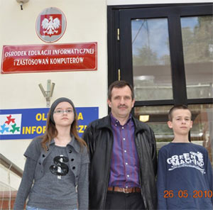 Uczniowie Publicznej Szkoły Podstawowej nr 1 w Dąbrowie Tarnowskiej Sylwia Lechowicz i Kasper Kądzielawa wraz z opiekunem konkursu mgr inż. Markiem Gawędą – nauczycielem informatyki i panem mgr Januszem Kądzielową – przewodniczącym Rady Rodziców uczestniczyli w warszawskiej gali kończącej tegoroczny Konkurs Informatyczny dla uczniów szkół podstawowych „Liga Zadaniowa”.