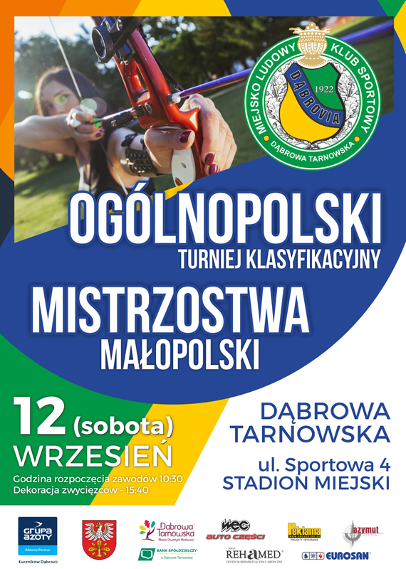 Już jutro 12 września 2015 roku Stadion Miejski w Dąbrowie Tarnowskiej stanie się areną zmagań łuczników z całej Polski w ramach „Ogólnopolskiego Turnieju Kwalifikacyjnego”. Równolegle zostaną przeprowadzone Mistrzostwa Małopolski w tej niezwykle technicznej i wymagającej precyzji oraz koncentracji dyscyplinie sportu. W zawodach tych w roli gospodarzy, a zarazem pretendentów do medalowych lokat wystąpią juniorzy i seniorzy miejscowej MLKS Dąbrovii. Organizatorami zawodów są: Polski Związek Łuczniczy, Urząd Marszałkowski Województwa Małopolskiego, Urząd Miejski w Dąbrowie Tarnowskiej, Starostwo Powiatowe w Dąbrowie Tarnowskiej oraz MLKS „DĄBROVIA” Dąbrowa Tarnowska jako organizator bezpośredni. Początek łuczniczej rywalizacji o 10:30. Zapraszamy do kibicowania naszym zawodnikom.