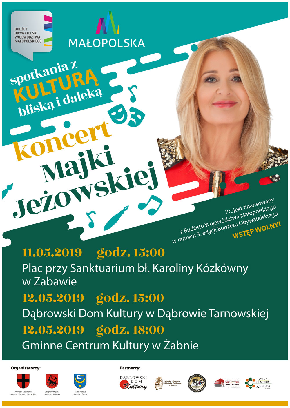 Niezwykły koncert z myślą o małych i dużych, całych rodzinach, odbędzie się w sali kinowej Dąbrowskiego Domu Kultury w niedzielne popołudnie 12 maja (godz. 15:00). Na scenie wystąpi Majka Jeżowska z zespołem muzycznym. Wydarzenie będzie realizowane w ramach zadania „Spotkania z kulturą bliską i daleką” jako część bloku imprez finansowanych z Budżetu Obywatelskiego Małopolski ze środków Województwa Małopolskiego. W ramach projektu odbywają się spotkania autorskie, koncerty, spektakle, ale przede wszystkim biblioteki w Radłowie, Dąbrowie Tarnowskiej i Żabnie wzbogacą swoje księgozbiory, które posłużą długofalowo szerokiej grupie czytelników. Realizując ten projekt spełniamy oczekiwania tych, którzy go poparli i na niego zagłosowali, a było to 3 337 osób! Organizatorami projektu są burmistrzowie 3 gmin: Burmistrz Żabna – Marta Herduś, Burmistrz Radłowa - Zbigniew Mączka, Burmistrz Dąbrowy Tarnowskiej - Krzysztof Kaczmarski. Zadanie realizowane jest w 3 gminach subregionu tarnowskiego przez: Gminne Centrum Kultury i Czytelnictwa w Radłowie, Dąbrowski Dom Kultury, Miejsko-Gminną Bibliotekę Publiczną i Gminne Centrum Kultury w Żabnie. Organizatorem koncertu niedzielnego jest Dąbrowski Dom Kultury.
