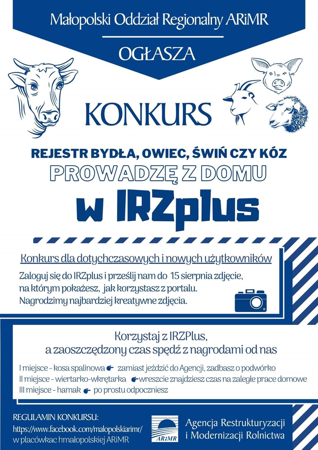 Niniejszy regulamin określa zasady, tryb oraz warunki konkursu „Rejestr bydła, owiec, świń czy kóz prowadzę z domu w IRZplus.” Ilekroć w treści Regulaminu jest mowa o Konkursie należy przez to rozumieć Konkurs „Rejestr bydła, owiec, świń czy kóz prowadzę z domu w IRZplus” Konkurs jest adresowany do posiadaczy zwierząt gospodarskich, zarówno tych korzystających już z Portalu IRZplus, jak i do tych, którzy rozpoczną korzystanie z tego narzędzia – dalej zwanych Uczestnikami. Opublikowanie szczegółowych warunków Konkursu oraz niniejszego regulaminu nastąpi na portalu Społecznościowym Facebook na stronie: https://www.facebook.com/MalopolskiARiMR/ (zwanej dalej “Fanpage”) oraz w placówkach Małopolskiego Oddziału Regionalnego ARiMR (Oddział Regionalny w Krakowie oraz Biura Powiatowe). Celem konkursu jest promocja korzystania z Portalu IRZplus przez jak największą liczbę beneficjentów.