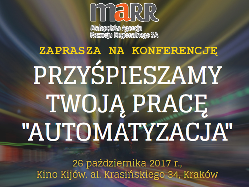 Małopolska Agencja Rozwoju Regionalnego ma przyjemność zaprosić Państwa na bezpłatną konferencję pt. „Przyśpieszamy Twoją pracę – Automatyzacja”. Konferencja odbędzie się 26 października 2017 r. w Kinie Kijów Centrum w Krakowie przy al. Krasińskiego 34. Nowe rozwiązania automatyzujące pracę to szansa na rozwój i budowę konkurencyjności. Nowoczesne technologie w tym zakresie są dostępne coraz powszechniej i często możliwe do wdrożenia od zaraz, przy wykorzystaniu zasobów, którymi dysponuje większość firm, instytucji czy też organizacji publicznych.