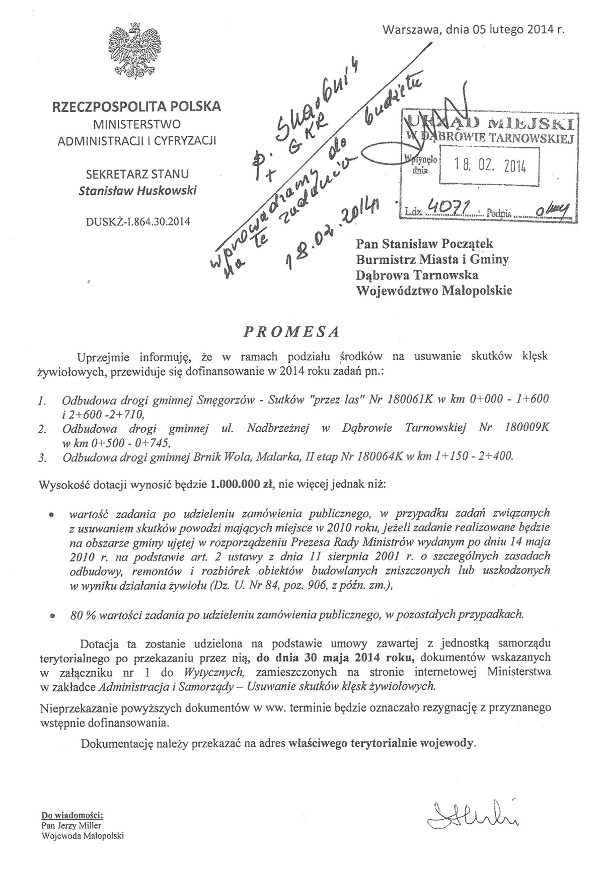 W ubiegłym tygodniu Burmistrz Dąbrowy Tarnowskiej Stanisław Początek otrzymał z rąk Wojewody Małopolskiego Jerzego Millera promesę na usuwanie skutków klęsk żywiołowych. Łącznie samorządy otrzymały prawie 99 mln zł z budżetu państwa, w tym także środki na usuwanie skutków ruchów osuwiskowych ziemi. Na usuwanie skutków powodziz rezerwy celowej budżetu państwa samorządy otrzymały 81 milionów 840 tysięcy złotych w tym: gminy 48 milionów - 60 tysięcy złotych, powiaty - 33 miliony 530 tysięcy złotych, samorząd województwa - 250 tysięcy złotych. Gmina Dąbrowa Tarnowska otrzymała promesę w wysokości 1 miliona złotych na odbudowę dróg w ramach usuwania skutków klęsk żywiołowych.