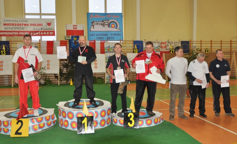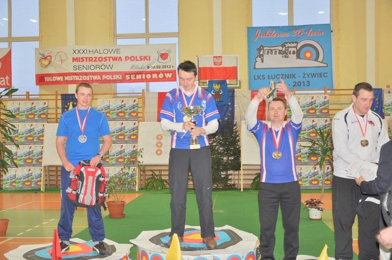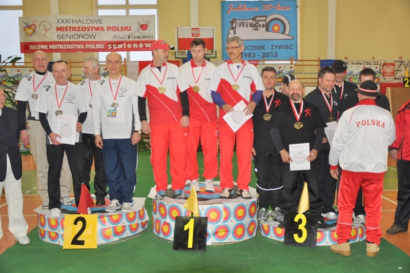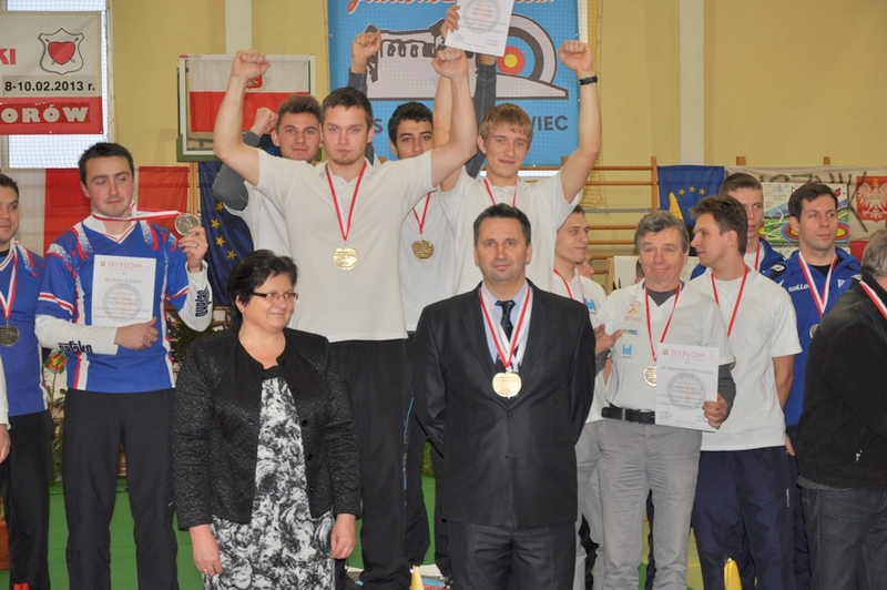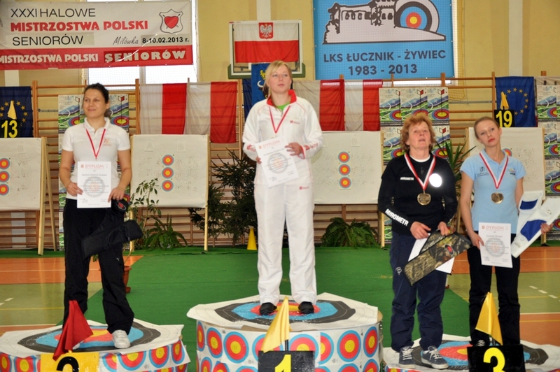 Nasi zawodnicy w większości konkurencji dochodzili do pojedynków finałowych. Rywalizację zaczęli najpierw w konkurencji mieszanej, tzw. MIXT (zawodnik i zawodniczka z jednego klubu), eliminując po kolei wszystkich przeciwników. Dopiero w starciu finałowym nasza dwójka: K. Mickiewicz i J. Kot, uległa zespołowi Łucznika Żywiec, tym samym zajmując drugą pozycję, zdobyli srebrny medal i tytuł V-ce Mistrzów Polski w konkurencji MIXT. Chwile później do walki przystąpił zespół kobiecy. I tu również „Dąbrovia” pokazała swoją siłę dochodząc do finału. Nie dużo brakło do złota, nasze zawodniczki musiały uznać wyższość rywalek i znowu drugi stopień na „pudle”, i znowu tytuł Halowego V-ce Mistrza Polski dla Dąbrowy Tarnowskiej. W tym momencie zawody można było zaliczyć do bardzo udanych. Nasi reprezentanci jednak nie zamierzali „oddać” medali w ostatniej konkurencji: indywidualnej. Będąc na fali wygrywali pojedynek za pojedynkiem. Niestety z rywalizacji odpadł po zaciętej walce Jakub Kot (19 miejsce), a w następnym etapie jago los podzieliła Małgorzata Mickiewicz (8 miejsce). W rywalizacji zostały dwie zawodniczki. Nie zawiodły. Podobnie jak tydzień temu w Mistrzostwach Województwa nie dały szans przeciwniczkom. Dotarły do finału i Tytuł Mistrza Polski miał się rozstrzygnąć pomiędzy dąbrowiankami. Tym razem dziewczyny zamieniły się miejscami na podium; Agata Bulwa złoto, Katarzyna Mickiewicz srebro i odpowiednio tytuły Halowej Mistrzyni Polski oraz V-ce Mistrzyni Polski na rok 2013. To był świetny weekend dla dąbrowskiego łucznictwa! Należy jednak zaznaczyć, że ojcem i matką tych sukcesów jest między innymi ekipa szkoleniowa: Pan Jerzy Kozak oraz Pani Beata Chmielewska, którym Zarząd Klubu składa wielkie podziękowania za serce i wielki wkład pracy w rozwój łucznictwa na dąbrowskim terenie.