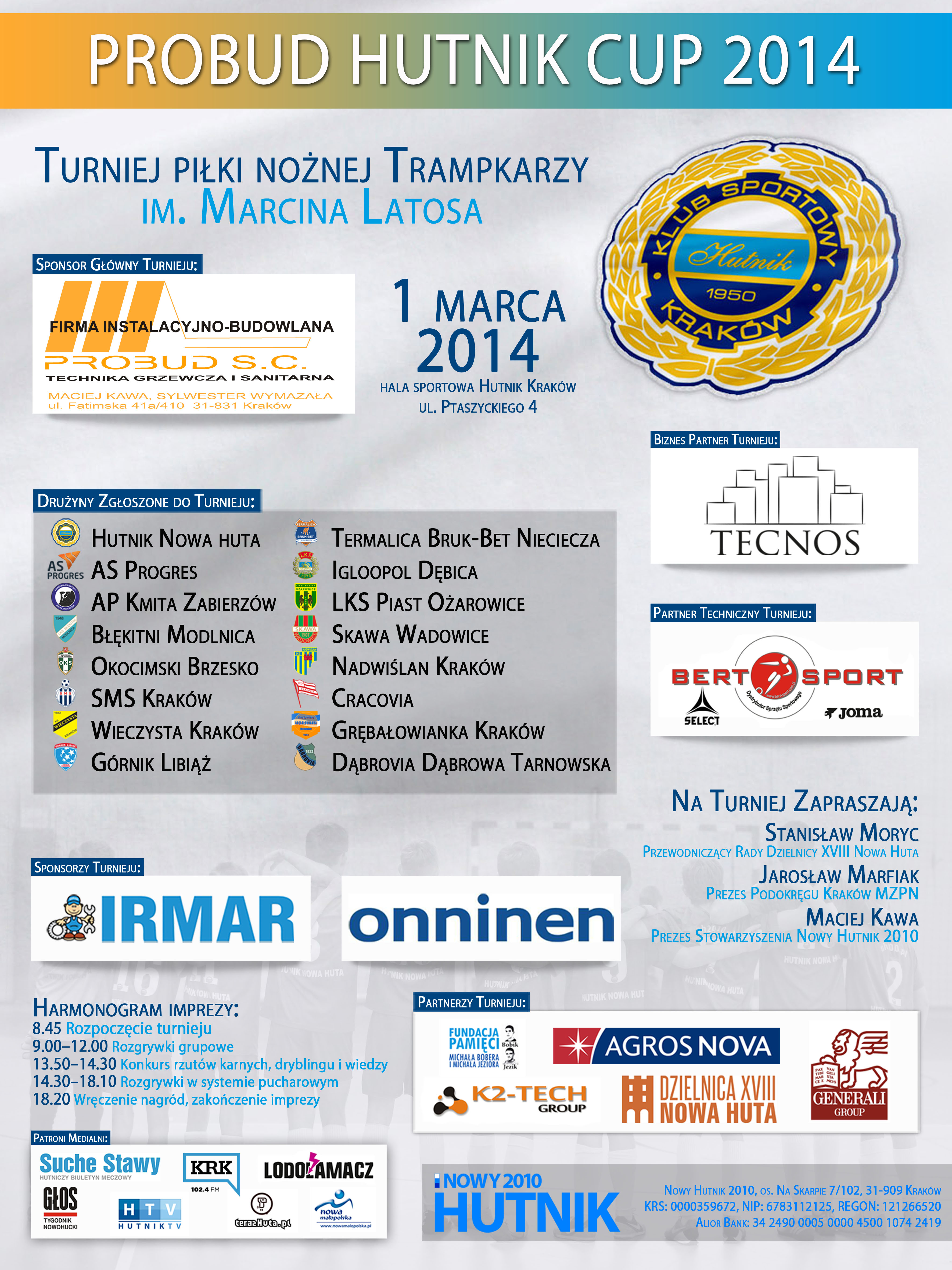 W tym roku Stowarzyszenie Nowy Hutnik 2010, które jest kontynuatorem tradycji KS Hutnik Kraków organizuje w dn. 1 marca br. turniej dla trampkarzy, a więc piłkarzy urodzonych w l. 1999-2000, którego patronem został właśnie Marcin Latos. Zainteresowanie turniejem było olbrzymie, więc lista startowa została bardzo szybko zamknięta. Co ciekawe do udziału w turnieju zgłosiły się nie tylko drużyny z Nowej Huty, ale również z Krakowa, Małopolski, Śląska i Podkarpacia. Emocje turniejowe rozpoczną się w hali przy ul. Ptaszyckiego 4 o godz. 8:45, a zakończą po godz. 18:00. Zespoły najpierw przystąpią do rywalizacji w czterech grupach, a następnie ok. 14:30 rozpocznie się faza pucharowa, która wyłoni zwycięzców turnieju. Na najlepsze drużyny i zawodników czekają nagrody i puchary. W przerwie turnieju (ok. godz. 13:45) organizatorzy zorganizują także konkursy m.in. wiedzy o piłce nożnej, dryblingu i rzutów karnych.