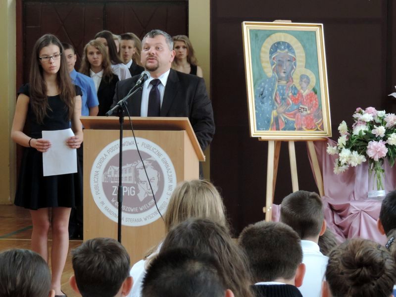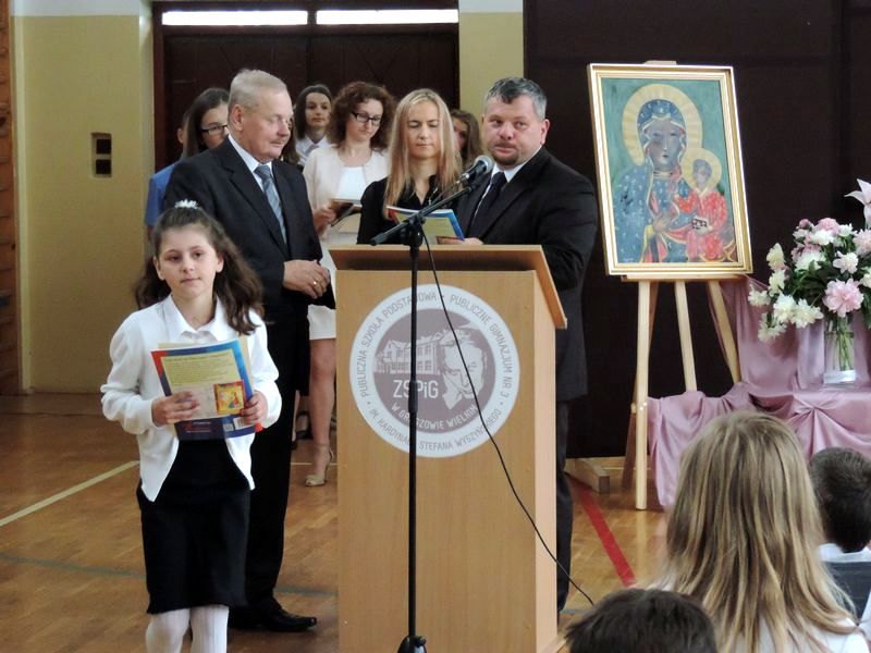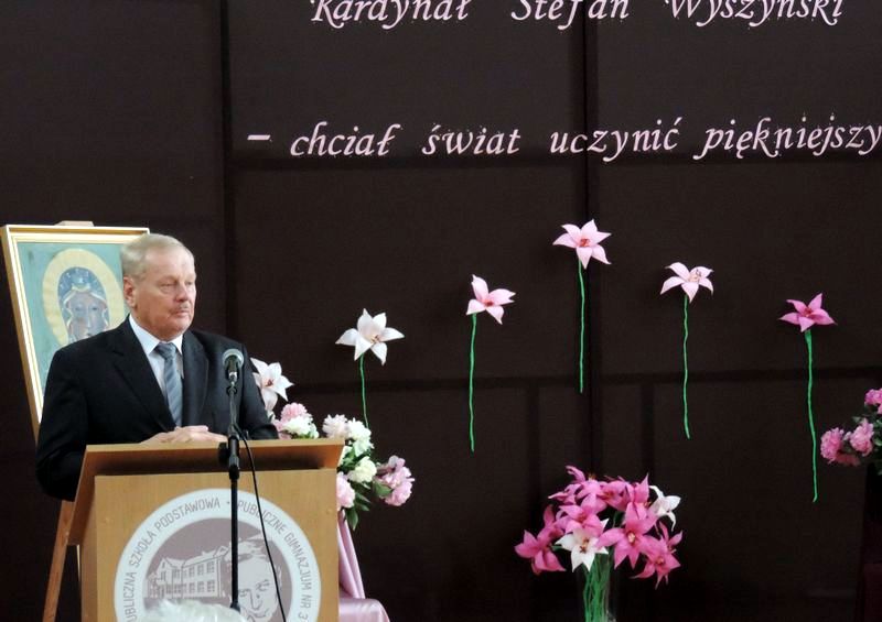 Dyrektor Szkoły pan Marcin Jarzwiec, zwracając się do zebranych, powiedział, że patronat Kardynała Stefana Wyszyńskiego - tak wyjątkowej osoby – to wyzwanie dla uczniów, nauczycieli i rodziców. Również burmistrz Dąbrowy Tarnowskiej pan Stanisław Początek podkreślił, że patron to wyzwanie i odpowiedzialność spadająca na tych, którzy utożsamiają się z wartościami głoszonymi przez patrona. Cieple słowa o Kardynale Wyszyńskim i o zaszczycie przyjęcia przez szkołę jego imienia mówił też dyrektor ZOSiP  w Dąbrowie Tarnowskiej pan Marian Gajda.