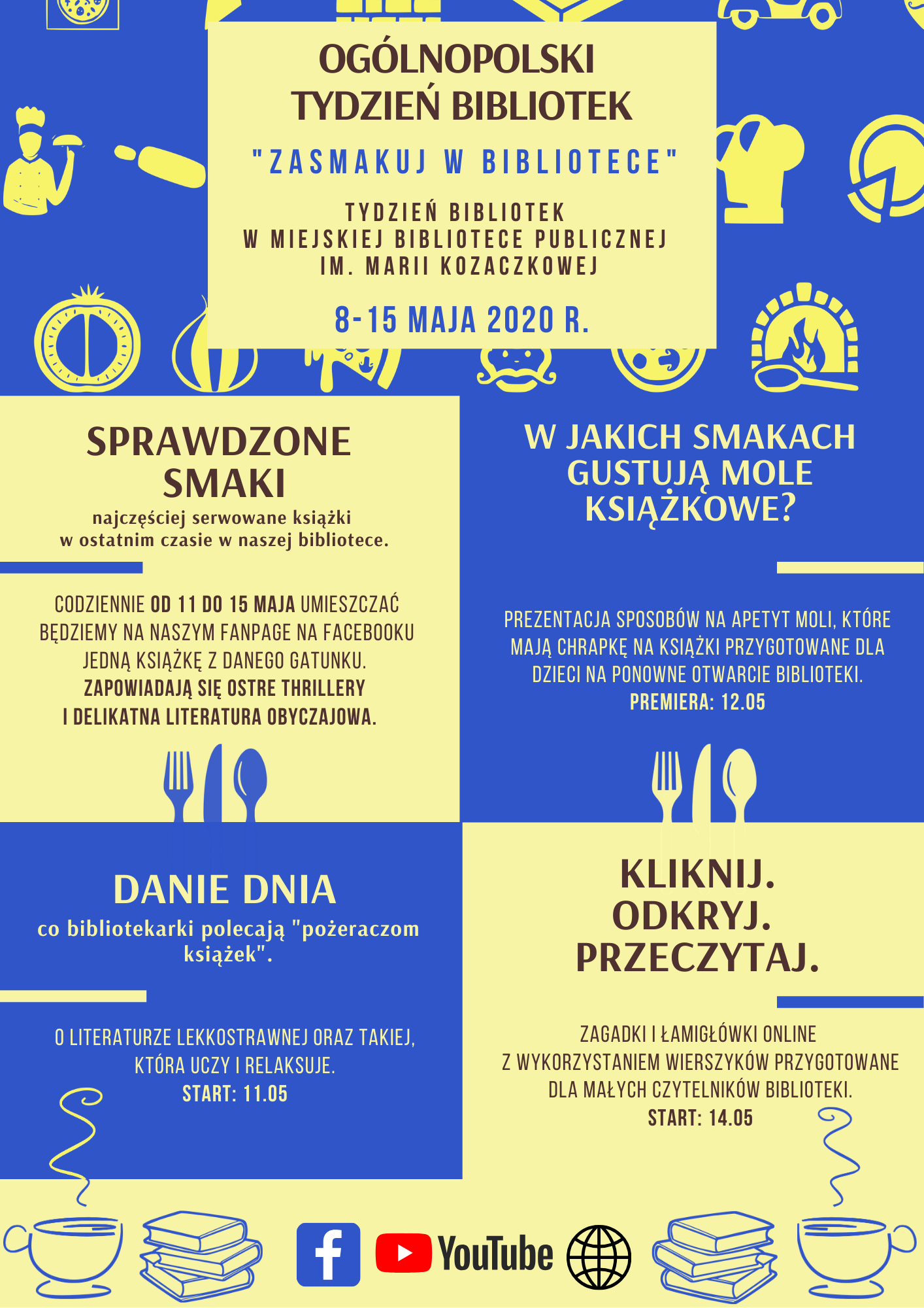 W piątek 8 maja 2020 r. rozpoczął się Ogólnopolski Tydzień Bibliotek, który potrwa do 15 maja 2020.r. W Miejskiej Bibliotece Publicznej im. Marii Kozaczkowej w Dąbrowie Tarnowskiej przebiega on w tym roku pod hasłem „Zasmakuj w bibliotece”. Celem akcji jest rozbudzenie apetytu na czytanie ciekawych książek, które można postrzegać jak intelektualny pokarm, w którego skład wchodzą sprawdzone oraz nowe potrawy, dania dnia i interesujące przystawki.