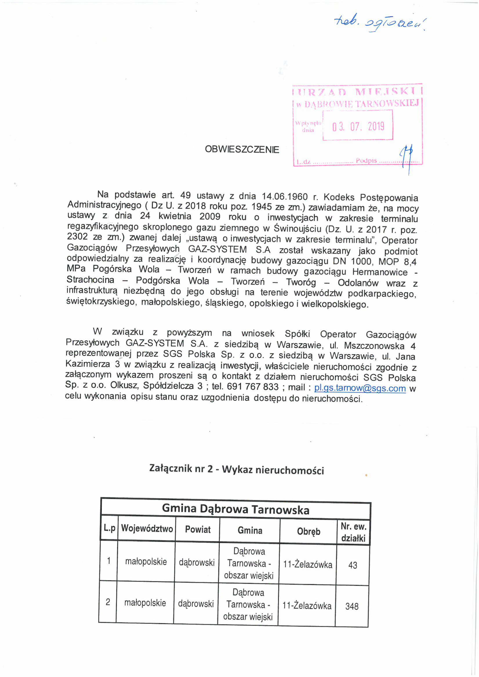 SGS Polska Sp. z.o.o. jako Wykonawca Nadzoru Inwestorskiego na podstawie Umowy zawartej w dniu 11 lipca 2018 r. z Operatorem Gazociągów Przesyłowych GAZ-SYSTEM oraz działając na podstawie Decyzji Wojewody Świętokrzyskiego nr 77/2017 z dnia 25 września 2017 r. oraz w oparciu o Ustawę z dnia 24 kwietnia 2009 r. o inwestycjach w zakresie terminalu regazyfikacyjnego skroplonego gazu ziemnego w Świnoujściu (Dz.U. 2009 Nr 84 poz. 700 z późn. zm.) w ramach zadania inwestycyjnego pn.: "Budowa gazociągu DN 1000, MOP 8,4 MPa Podgórska Wola - Tworzeń wraz z infrastrukturą towarzyszącą" poniższym obwieszczeniem wzywa właścicieli wymienionych w załączniku do uzgodnienia dostępu do nieruchomości. Niżej wymienione nieruchomości nie posiadają uregulowanego stanu prawnego lub oznaczenie właściciela w księdze wieczystej jest nieaktualne. Kontakt do Biura WNI - Gazociąg Podgórska Wola pod nr tel. 691-767-833