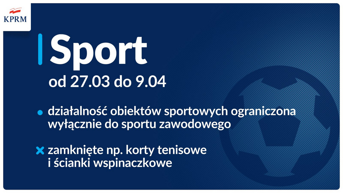 Działalność obiektów sportowych zostanie ograniczona wyłącznie do sportu zawodowego. Wszelkie wydarzenia będą mogły się odbywać bez udziału publiczności.