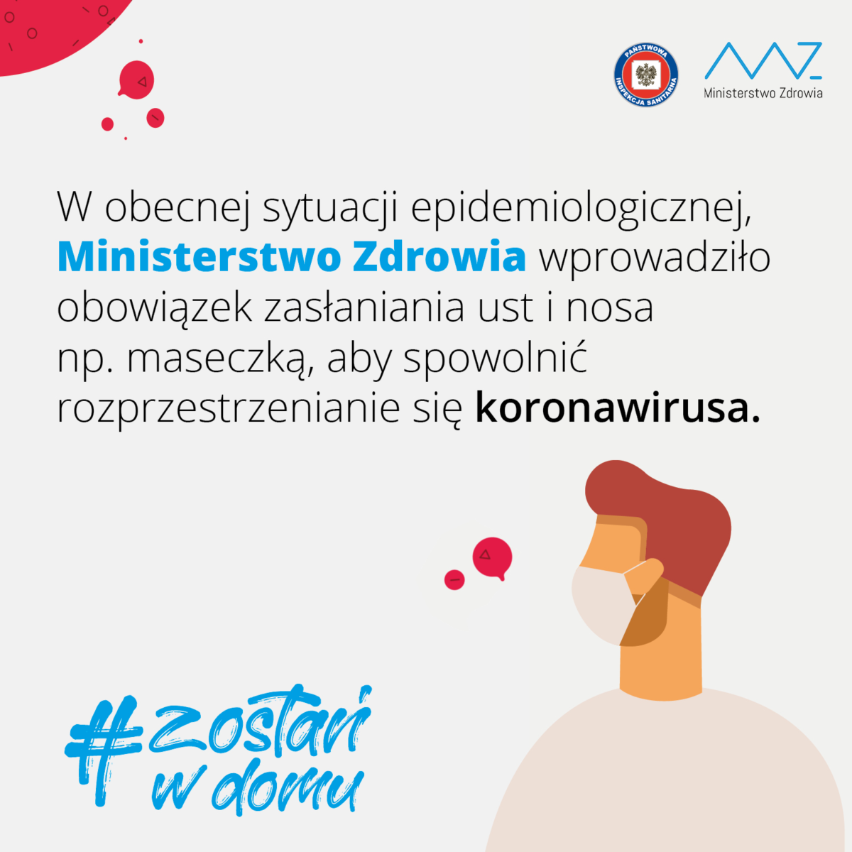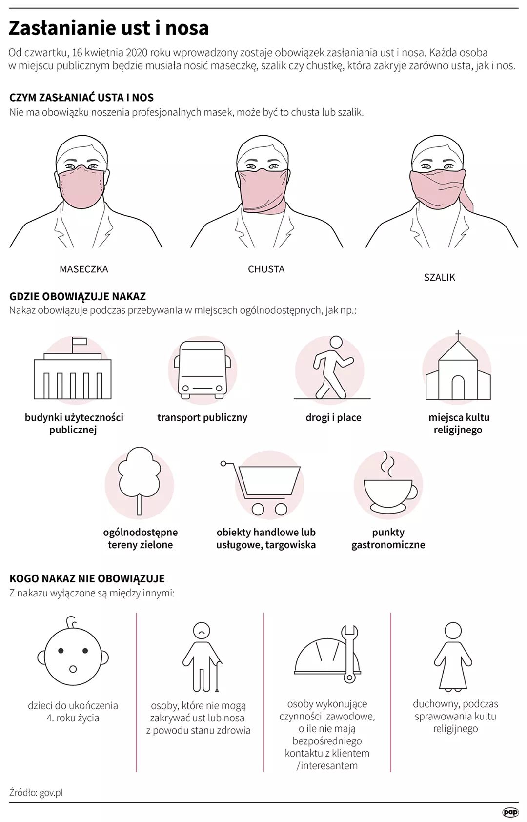 W zawiązku z działaniami zmierzającymi do ograniczenia rozpowszechniania się koronawirusa SARS-COV-2 od jutra, czyli od 16 kwietnia każda osoba przebywająca w miejscu publicznym będzie miała obowiązek zasłaniania ust i nosa! Zasłanianie ust i nosa będzie obowiązkiem dla każdego i przy każdym wyjściu z domu - niekoniecznie nawet przy użyciu maseczki - może to być szalik czy chusteczka.