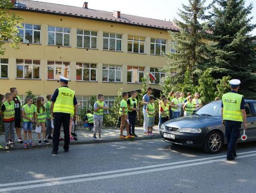 Po tej prezentacji udaliśmy się na ulicę Zazamcze, obok szkoły. Policjanci zatrzymywali przejeżdżające samochody. Jakie było zaskoczenie kierowców, gdy zamiast zwyczajowej kontroli dokumentów, otrzymywali od uczniów przygotowane wcześniej ulotki. Każdy z zatrzymanych kierowców odwzajemnił się miłym uśmiechem. Mamy nadzieję, że zawsze przejeżdżając obok naszej szkoły zdejmą nogę z gazu.