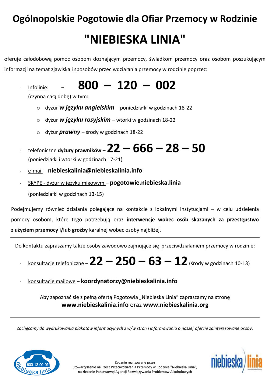 "Niebieska linia" odejmuje również działania polegające na kontakcie z lokalnymi instytucjami w celu udzielenia pomocy osobom, które tego potrzebują oraz interwencje wobec osób skazanych za przestępstwo z użyciem przemocy i/lub groźby karalnej wobec osoby najbliżej. Prowadzi także konsultacje dla specjalistów - osób, które w pracy zawodowej spotykają się z problematyką przemocy w rodzinie.