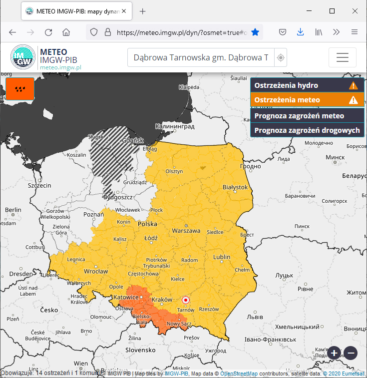 Centralne Biuro Prognoz Meteorologicznych IMGW-PIB Oddział w Krakowie wydało ostrzeżenia meteorologiczne o prognozowanych intensywnych silnych opadach deszczu skutkujących gwałtownymi przyborami stanów wód dla terenów województwa małopolskiego w tym dla powiatu dąbrowskiego. Ważność ostrzeżeń: od 30 do 31 sierpnia 2021 r. Prognozowane są opady deszczu o natężeniu umiarkowanym i silnym, gdzie całkowita suma opadów opadu lokalnie od 30 mm do 50 mm. Miejscami możliwe są również burze. W obszarach występowania prognozowanych intensywnych opadów deszczu, prognozowane są wzrosty poziomu wody do strefy stanów wysokich. Na mniejszych rzekach wzrosty mogą mieć gwałtowny charakter. W miejscach wystąpienia szczególnie intensywnych opadów, istnieje możliwość przekroczenia stanów ostrzegawczych, a punktowo i krótkotrwale także alarmowych. W przypadku istotnych zmian w czasie lub przebiegu zjawiska Ostrzeżenie może ulec zmianie.