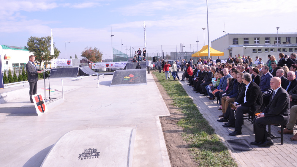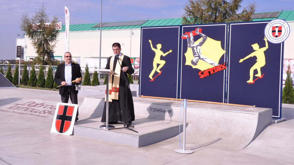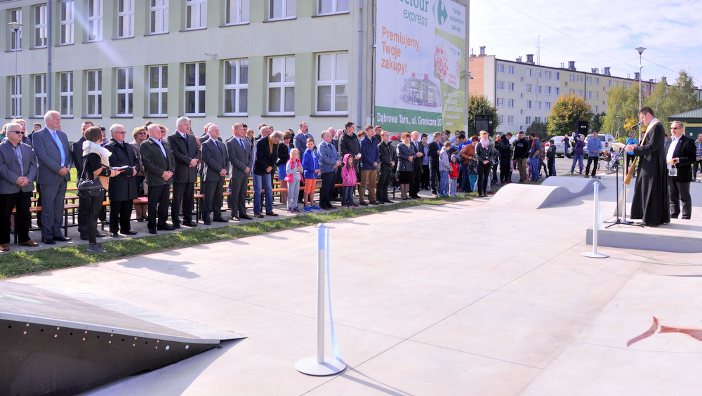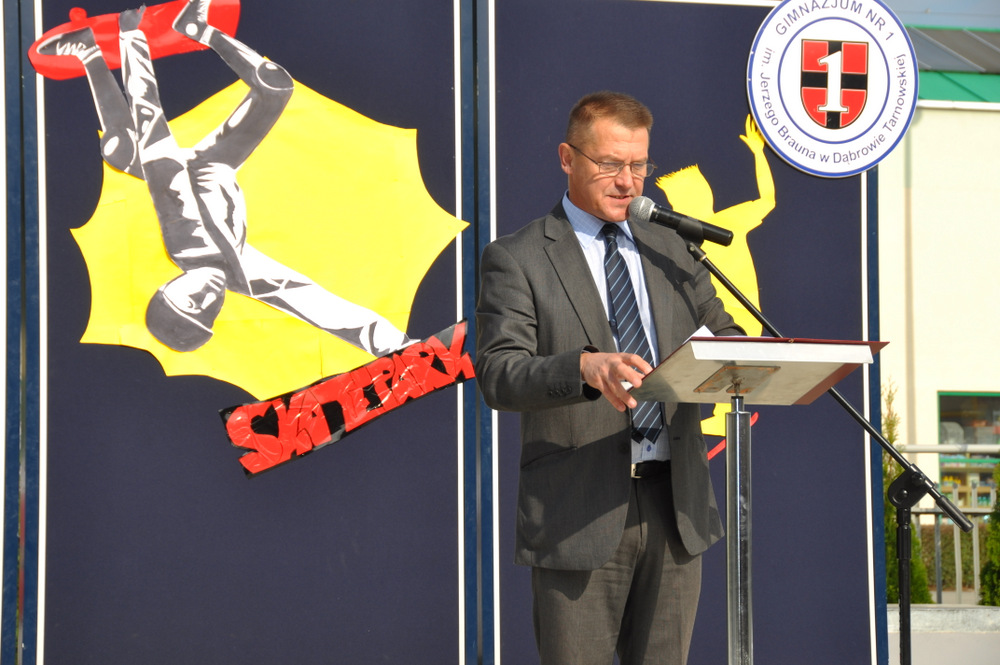 Dyrektor dąbrowskiego Gimnazjum nr 1 Krzysztof Krakowski przywitał gości, którzy swoją obecnością zaszczycili uroczystość otwarcia: Burmistrza Dąbrowy Tarnowskiej Stanisława Początka, Przewodniczącego Rady Miejskiej w Dąbrowie Tarnowskiej Władysława Knutelskiego wraz z radnymi, Starostę Powiatu Dąbrowskiego Tadeusza Kwiatkowskiego i Wicestarostę Roberta Panterę,zastępcę Burmistrza Marka Minorczyka dyrektora ZOSiP w Dąbrowie Tarnowskiej Mariana Gajdę, dyrektorów szkół podstawowych, gimnazjów i szkół ponadgimnazjalnych z terenu gminy Dąbrowa Tarnowska, kierowników referatów Urzędu Miejskiego w Dąbrowie Tarnowskiej: Marcina Stefańczyka, Krzysztofa Orwata i Witolda Reczka wraz ze współpracownikami, wszystkich nauczycieli, rodziców, uczniów i licznie przybyłych Mieszkańców Dąbrowy Tarnowskiej. W swoim przemówieniu dyrektor szkoły wyraził zadowolenie z tego, że nowo otwarty skatepark zlokalizowany na terenie Gimnazjum Nr 1 wraz z kompleksem boisk sportowych jest gwarantem realizacji nowoczesnej edukacji sportowej, która dla uczniów oraz społeczności Dąbrowy Tarnowskiej stanowi ważną propozycję spędzania wolnego czasu, a przede wszystkim jest elementem umożliwiającym realizację sportowych zamiłowań dąbrowskiej  młodzieży.
