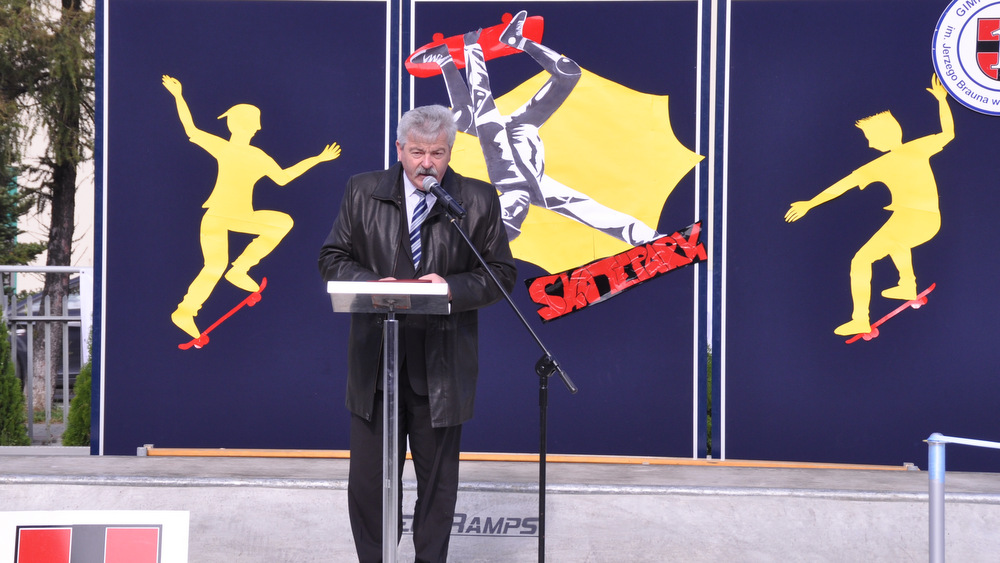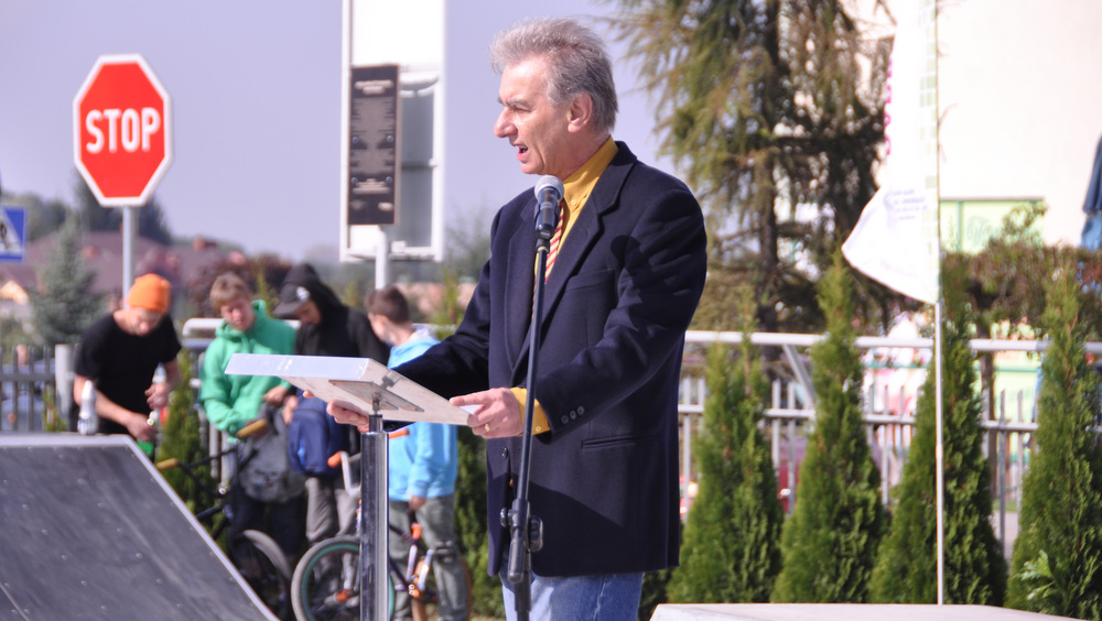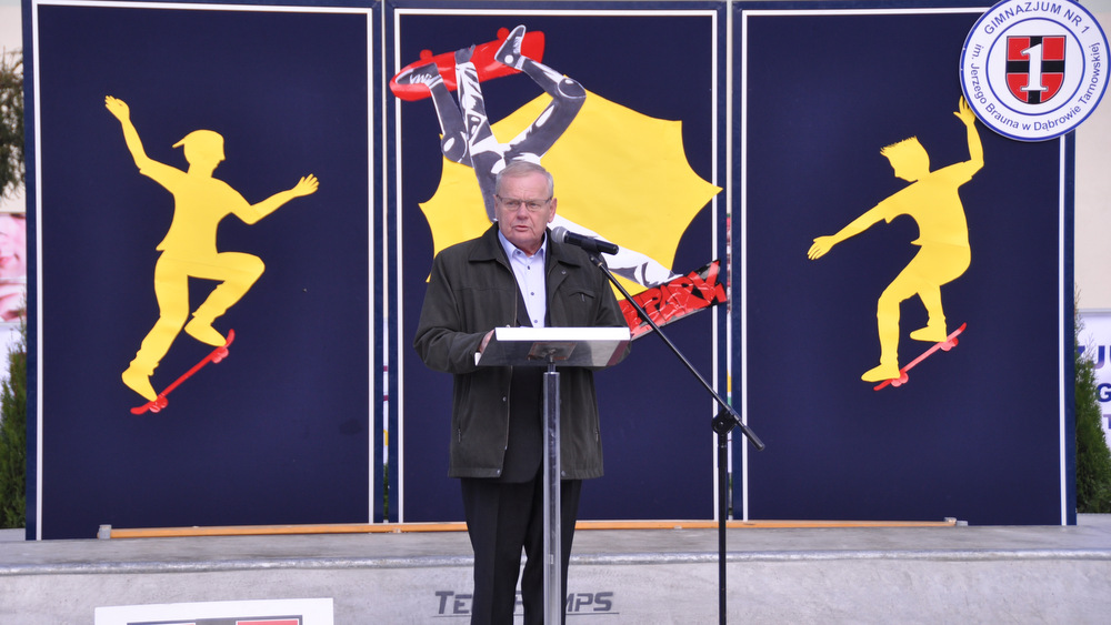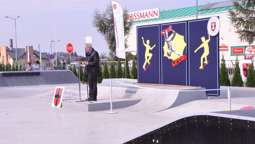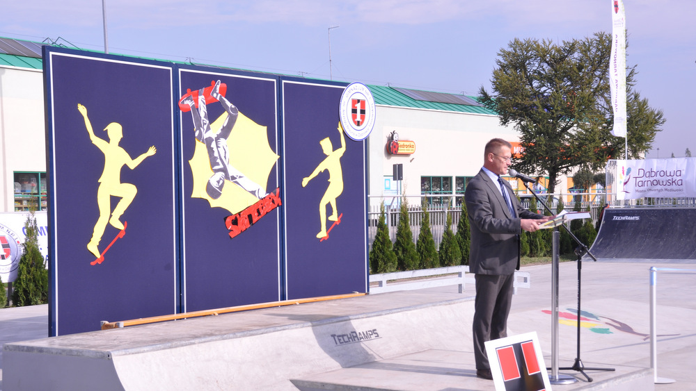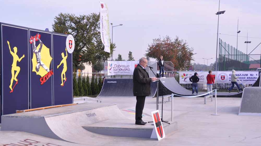 Zabierając głos Burmistrz Dąbrowy Tarnowskiej Stanisław Początek powiedział m.in.: Chciałbym tutaj wspomnieć o spotkaniu z młodzieżą w jakim uczestniczyłem w Zespole Szkół Ponadgimnazjalnych Nr 2 w Dąbrowie Tarnowskiej w pierwszych dniach kwietnia bieżącego roku. Była to debata uczniów i pracowników samorządowych, podczas której padły pytania o atrakcyjność Dąbrowy Tarnowskiej i gminy dla młodzieży. Wtedy to zapewniłem młodzież, że jeszcze przed końcem bieżącego roku będzie mogła korzystać z nowoczesnego, spełniającego najwyższe standardy jakościowe skateparku. Jest mi ogromnie miło, że zobowiązanie jakie podjąłem wobec młodzieży zostało wypełnione w założonym czasie. Mam nadzieję, że niedawno rozpoczęta jesień dostarczy nam wielu pogodnych dni, tak aby możliwe było korzystanie z tego nowego obiektu i dostarczało użytkownikom i oglądającym wiele frajdy. Otwieramy dzisiaj pierwszy w powiecie skatepark. Jest to zarazem jeden z niewielu obiektów tego typu w całym subregionie tarnowskim. Można wyliczać całą listę korzyści związanych z posiadaniem skateparku na terenie naszego miasta i blisko osiedla, gdzie nie brakuje młodych ludzi. Jest wśród nich stworzenie miejsca spotkań młodzieży, która aktywnie spędzi czas doskonaląc sprawność i kondycję fizyczną. Jest także promocja ruchu na świeżym powietrzu, którego nigdy za wiele. Najważniejszą jednak korzyścią jest nadanie bezpiecznych ram dyscyplinom sportu, określanych jako ekstremalne, które młodzież lubi uprawiać spontanicznie, często robiąc to w miejscach do tego nieprzystosowanych. Przenosząc swoje deskorolki i BMX-y do skateparku młodzież zmniejsza ryzyko groźnych uszkodzeń ciała. Badania statystyczne prowadzone kilka lat temu w Filadelfii wskazują, że bezpieczeństwo osób użytkujących skateparki o pewnym standardzie jakości, i prawidłowo zachowujących regulamin korzystania z takich obiektów jest porównywalne z bezpieczeństwem uprawiania koszykówki czy piłki nożnej.  Dzisiejszy dzień to dobry moment by poczuć wspólną satysfakcję, że w ostatnich latach nasza gmina przeszła bardzo imponującą przemianę, jeśli chodzi o tworzenie świetnych warunków dla profesjonalnego czy amatorskiego uprawiania sportu. Szczególne znaczenie ma tutaj zapewnienie szerokiej oferty sportowo-rekreacyjnej dla młodego pokolenia zgodnie z maksymą „W zdrowym ciele zdrowym duch”. Osiem lat temu oddana została do użytku Kryta Pływalnia w Dąbrowie Tarnowskiej. Był to idealny moment na jej powstanie – dzisiaj takie przedsięwzięcie byłoby o wiele bardziej kosztowne i trudniejsze do zrealizowania. Za nią poszły kolejne inwestycje: orliki, boiska wielofunkcyjne przy szkołach na terenie gminy zarówno w Dabrowie Tarnowskiej jak i w sołectwach takich jak Nieczajna Górna, Lipiny i Gruszów Wielki. Opracowano także projekty modernizacji boisk w kolejnych sołectwach. Projekt w Smęgorzowie został pozytywnie oceniony i oczekuje na dofinansowanie na liście rezerwowej. Z kolei boisko w Laskówce Chorąskiej jest na etapie oceny wniosku o dofinansowanie. Przy korzystnym przeliczeniu kursu Euro w Urzędzie Marszałkowskim w Krakowie boisko w Smęgorzowie będzie zmodernizowane do końca tego roku, a boisko w Laskówce Chorąskiej do końca marca 2015 r. Ważnym punktem na sportowej mapie gminy jest pełnowymiarowa Hala Sportowa im. Agaty Mróz-Olszewskiej – jedyna taka w całym powiecie. Jej rola w czasie ferii zimowych, w organizacji zajęć dla dzieci i młodzieży jest nieoceniona. Niemniej ważna jest rola widowiskowa hali – tutaj odbywały się międzynarodowe turnieje jak na przykład kwietniowy turniej piłki ręcznej juniorów, w którym wystąpiły reprezentacje narodowe Polski, Czech, Serbii i Węgier. Możliwość oglądania wielkiego sportu w Dąbrowie Tarnowskiej to nie tylko atrakcja dla fanów, ale być może inspiracja dla młodego pokolenia. Inwestycje w infrastrukturę sportową są także inwestycjami w zdrowie mieszkańców. Samorząd gminny stara się aby oferta sportowo - rekreacyjna obejmowała każdą grupę wiekową. Stąd siłownie zewnętrzne w Parku Miejskim w Dąbrowie Tarnowskiej przy Hali Sportowej i w Lipinach. Urządzenia siłowe znajdują się także na dąbrowskich placach zabaw – tak, aby możliwe było łączenie opieki nad dziećmi z własną aktywnością ruchową dorosłych. Dzisiejsze otwarcie dowodzi, że samorząd gminny pamięta o osobach w wieku młodzieńczym, na etapie życia między dzieciństwem a dorosłością. W tym miejscu chciałbym wyrazić wdzięczność osobom, które odpowiedzialne są za tworzenie sportowego wizerunku gminy. Podziękowanie kieruję tutaj dla Rady Miejskiej na czele z Panem Przewodniczącym Rady Miejskiej Władysławem Knutelskim za sfinansowanie tego zadanie. Dziękuję mojemu zastępcy Markowi Minorczykowi. Realizacja przedsięwzięcia „Budowa Skate Parku przy Gimnazjum Nr 1 w Dąbrowie Tarnowskiej”, które dzisiaj oficjalnie oddajemy do użytku to w ogromnej mierze wynik pracy Referatu Inwestycji i Zamówień Publicznych z kierownikiem Marcinem Stefańczykiem i załogą: Piotrem Sacha i Szymonem Lichorobcem. Dziękuję także Dyrektorowi Publicznego Gimnazjum Nr 1 w Dabrowie Tarnowskiej Krzysztofowi Krakowskiemu za dobrą współpracę przy realizacji inwestycji. Dziękuję firmie TechRamps, która przygotowała obiekt – panom Piotrowi Nowakowi i Grzegorzowi Górskiemu. Podziękowania należą się również podwykonawcy -  firmie Instal System pana Marka Golonki. Przy dzisiejszej okazji warto wspomnieć też o promocji naszej gminy jako przyjaznej dla sportu, zwłaszcza sportu rodzinnego. Niedawno Dąbrowa Tarnowska otrzymała statuetkę ufundowaną przez Prezydenta RP Bronisława Komorowskiego za zdobycie I miejs