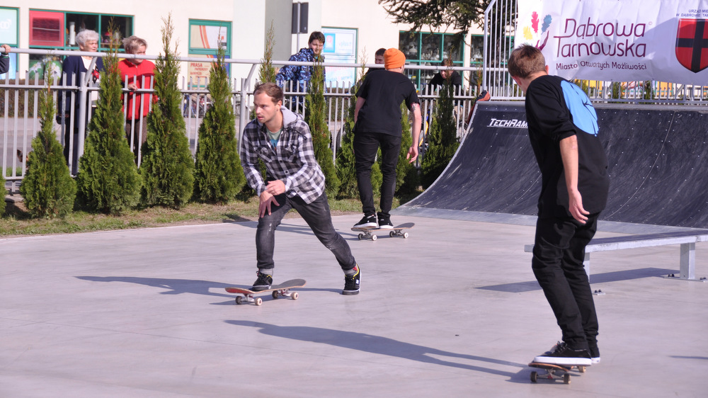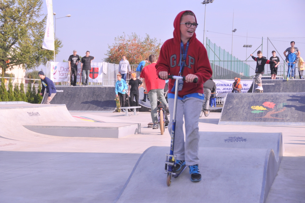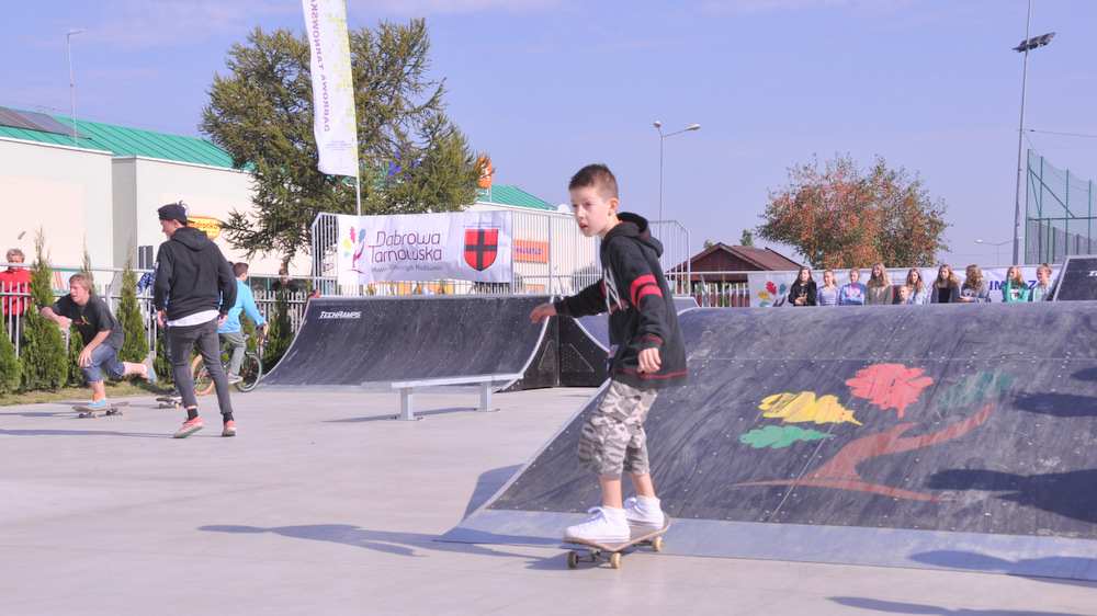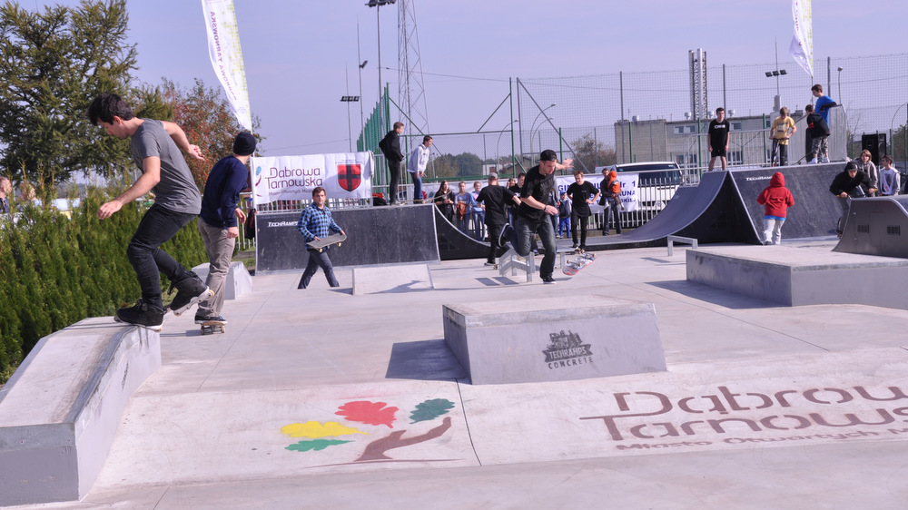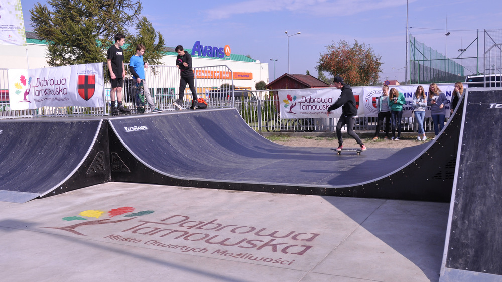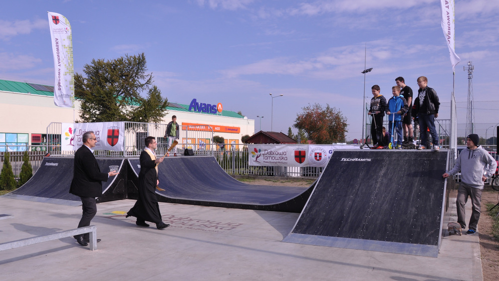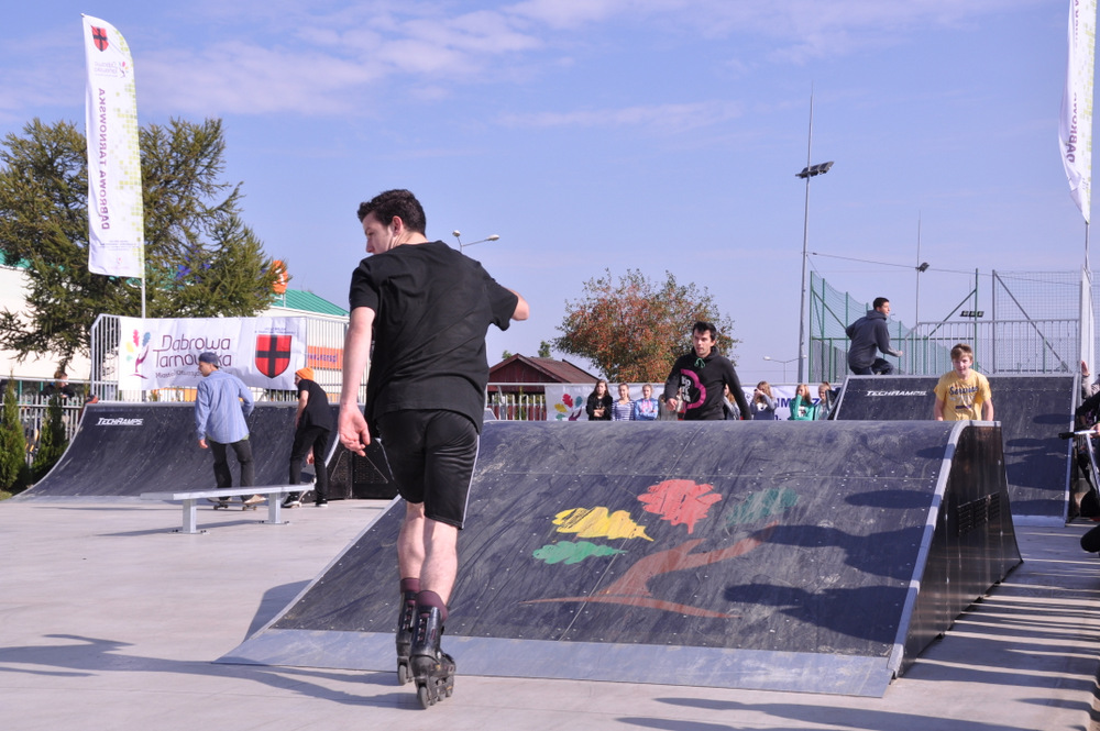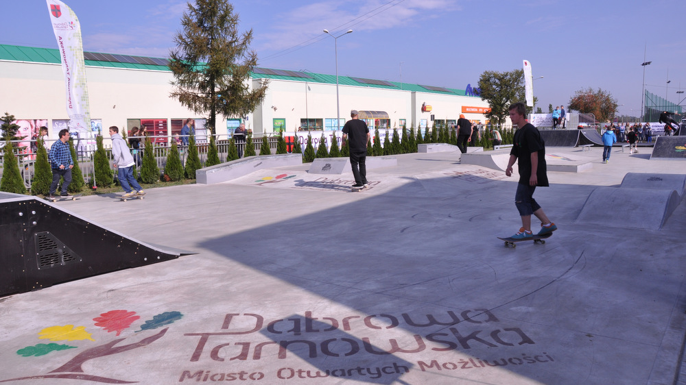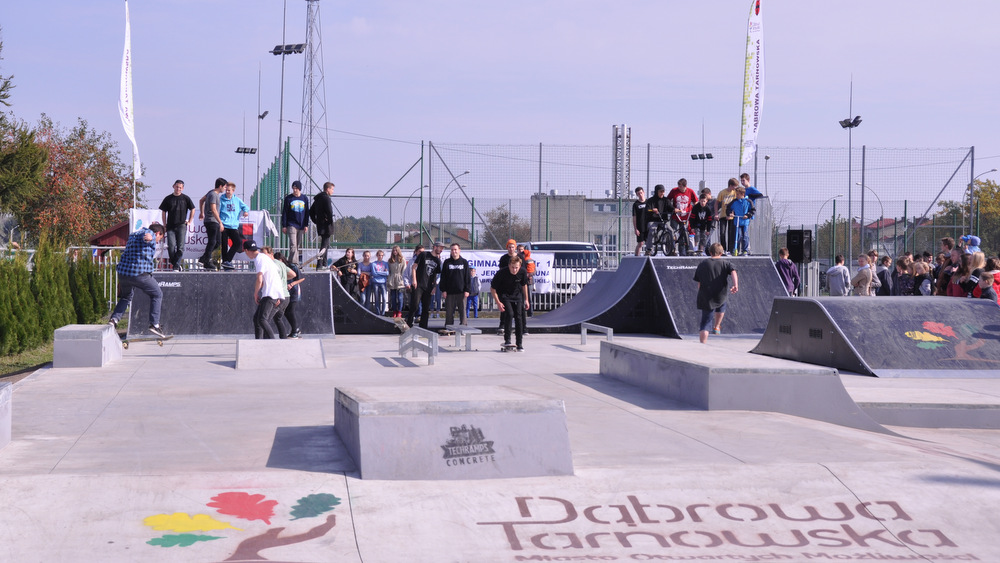 4 października br.w naszym mieście uroczyście oddano do użytku nowy skatepark, co jest  kolejnym dowodem na to, że Dąbrowa Tarnowska zasługuje na miano „miasta otwartych możliwości”. Przy pięknej jesiennej pogodzie otwarliśmy inwestycję, tym razem skierowaną głównie do ludzi młodych. Świadczy to o tym, że samorząd Gminy Dąbrowa Tarnowska dba o kreowanie przyjaznej przestrzeni dla młodzieży. Nie jest przesadą stwierdzenie, że realizacja tej inwestycji to w dużej mierze wynik starań młodzieży, która podzieliła się z samorządem gminnym swoimi pomysłami na zagospodarowanie czasu wolnego i przestrzeni miejskiej. Na adres Rady Miejskiej i do Urzędu Miejskiego w Dąbrowie Tarnowskiej wpływały listy w tej sprawie. Ponadto młodzież spotykała się z Burmistrzem  celem przedstawienia swoich koncepcji rozwoju miasta i gminy, a motyw skateparku często się pojawiał w tych rozmowach. Zawsze ceniłem współpracę z młodymi mieszkańcami naszej gminy i tym większa jest satysfakcja nas wszystkich, że byli oni jedną z sił sprawczych tej inwestycji – powiedział Burmistrz Stanisław Początek. Dąbrowski Skatepark to niemal 600 m2 płyty betonowej o nawierzchni specjalnie przystosowanej do uprawiania sportów ekstremalnych takich jak jazda na deskorolce, rowerze BMX, hulajnodze wyczynowej czy rolkach. Wykonawcą zadania jest firma Techramps z Krakowa,podwykonawcą była dąbrowska firma Instal- System Pana Marka Golonki.  Koszt inwestycji wyniósł 412 665,00 zł. Układ przestrzenny oddawanego do użytku skateparku w Dąbrowie Tarnowskiej zapewnia warunki do uprawiania skatingu tak przez amatorów jak i przez profesjonalistów.