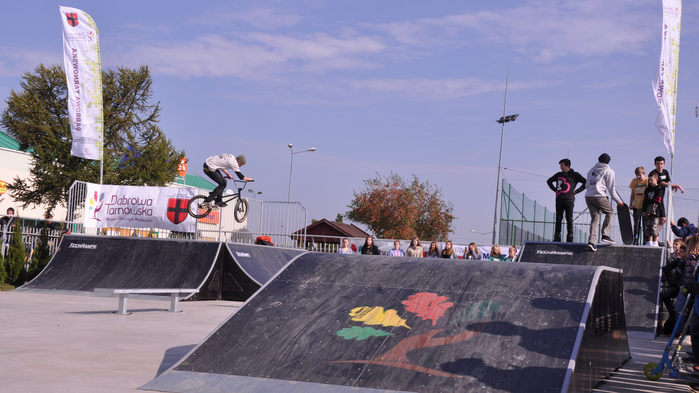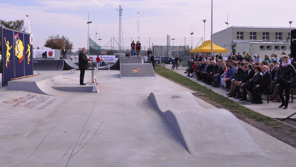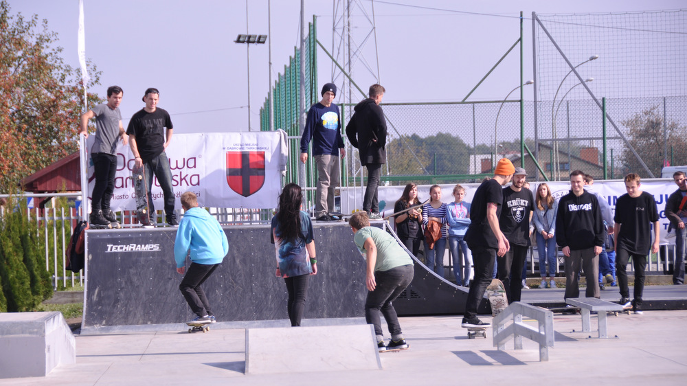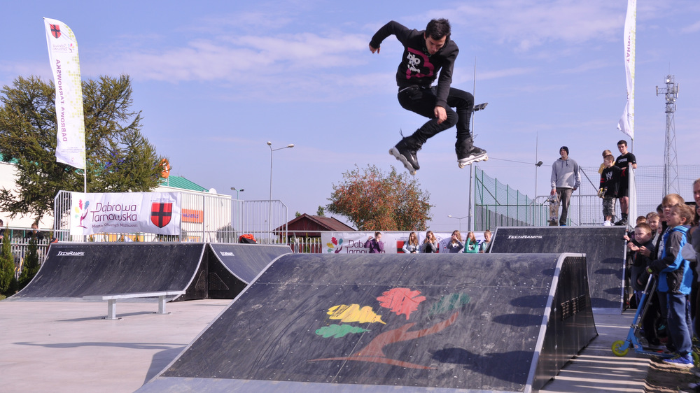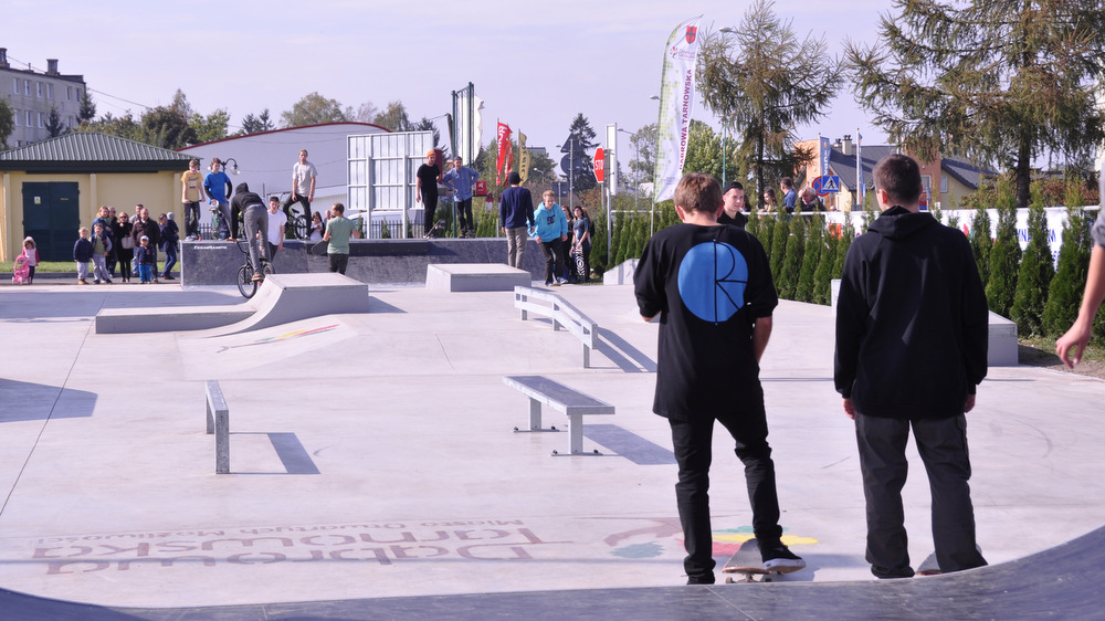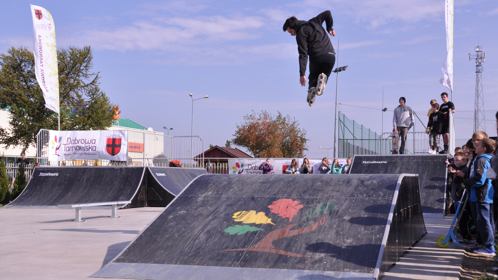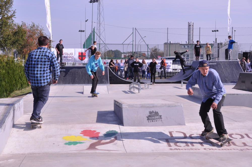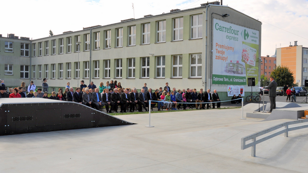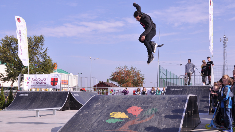 4 października br.w naszym mieście uroczyście oddano do użytku nowy skatepark, co jest  kolejnym dowodem na to, że Dąbrowa Tarnowska zasługuje na miano „miasta otwartych możliwości”. Przy pięknej jesiennej pogodzie otwarliśmy inwestycję, tym razem skierowaną głównie do ludzi młodych. Świadczy to o tym, że samorząd Gminy Dąbrowa Tarnowska dba o kreowanie przyjaznej przestrzeni dla młodzieży. Nie jest przesadą stwierdzenie, że realizacja tej inwestycji to w dużej mierze wynik starań młodzieży, która podzieliła się z samorządem gminnym swoimi pomysłami na zagospodarowanie czasu wolnego i przestrzeni miejskiej. Na adres Rady Miejskiej i do Urzędu Miejskiego w Dąbrowie Tarnowskiej wpływały listy w tej sprawie. Ponadto młodzież spotykała się z Burmistrzem  celem przedstawienia swoich koncepcji rozwoju miasta i gminy, a motyw skateparku często się pojawiał w tych rozmowach. Zawsze ceniłem współpracę z młodymi mieszkańcami naszej gminy i tym większa jest satysfakcja nas wszystkich, że byli oni jedną z sił sprawczych tej inwestycji – powiedział Burmistrz Stanisław Początek. Dąbrowski Skatepark to niemal 600 m2 płyty betonowej o nawierzchni specjalnie przystosowanej do uprawiania sportów ekstremalnych takich jak jazda na deskorolce, rowerze BMX, hulajnodze wyczynowej czy rolkach. Wykonawcą zadania jest firma Techramps z Krakowa,podwykonawcą była dąbrowska firma Instal- System Pana Marka Golonki.  Koszt inwestycji wyniósł 412 665,00 zł. Układ przestrzenny oddawanego do użytku skateparku w Dąbrowie Tarnowskiej zapewnia warunki do uprawiania skatingu tak przez amatorów jak i przez profesjonalistów.
