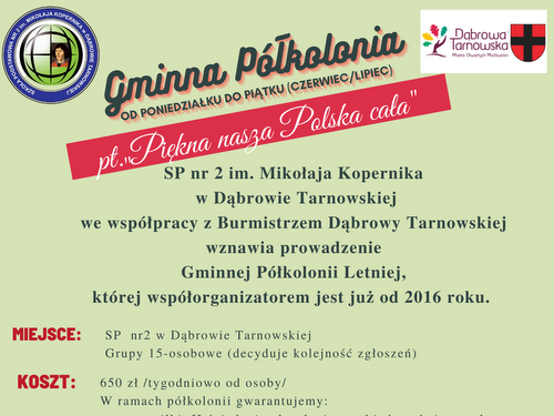 Szkoła Podstawowa Nr 2 im. Mikołaja Kopernika w Dąbrowie Tarnowskiej we współpracy z Burmistrzem Dąbrowy Tarnowskiej wznawia prowadzenie Gminnej Półkolonii Letniej, której współorganizatorem jest od 2016 r. Półkolonia będzie odbywać się w II turnusach w terminach: 27.06 – 08.07.2022 r. oraz 11.07 – 22.07.2022 r. Zgłoszenia i wpłaty w sekretariacie SP Nr 2. Czytaj dalej