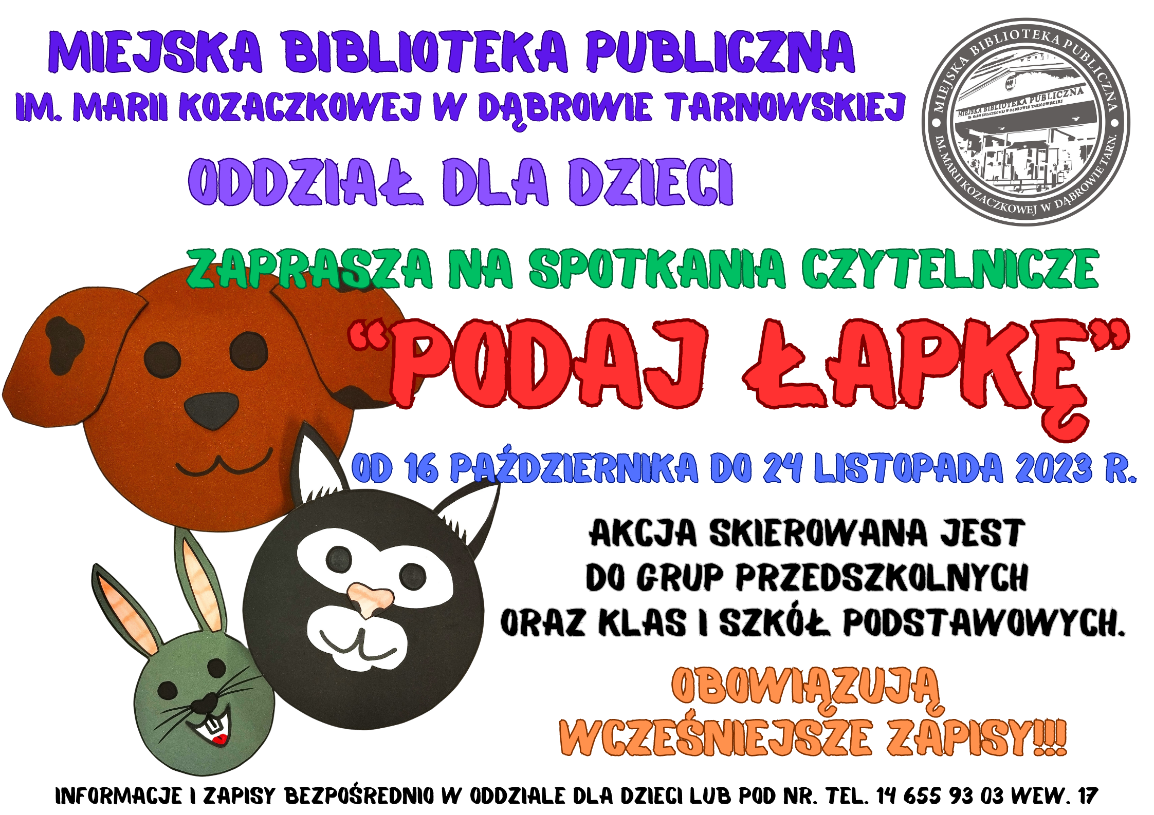 W związku z tym dąbrowska książnica przyjmuje zgłoszenia zorganizowanych grup przedszkolnych i klas I szkół podstawowych na zajęcia czytelnicze o tematyce pro-zwierzęcej pod hasłem "Podaj łapkę". Czytaj dalej