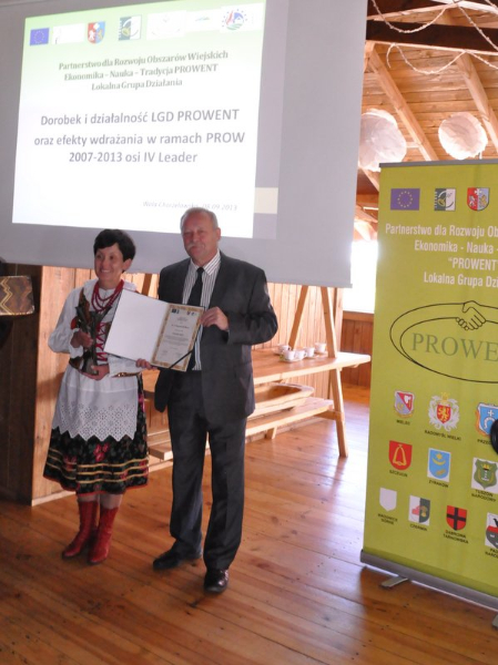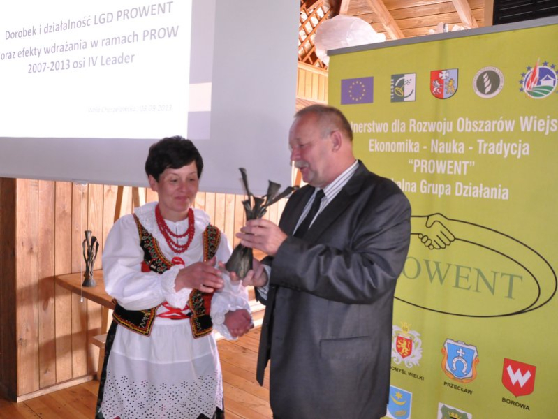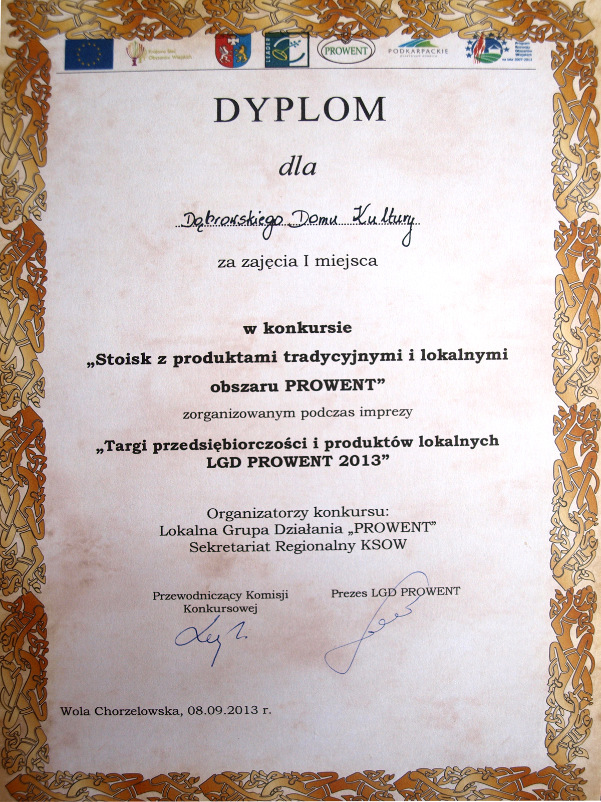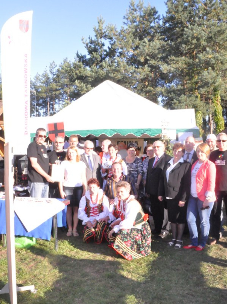 W niedzielę 8 września 2013 r. w Woli Chorzelowskiej odbyły się targi przedsiębiorczości i produktów lokalnych Lokalnej Grupy Działania „PROWENT” 2013. Stoiska prezentowało 13 gmin – członków LGD „PROWENT z powiatów: mieleckiego, dąbrowskiego i dębickiego. Gmina Dąbrowa Tarnowska była reprezentowana przez Dąbrowski Dom Kultury przy wsparciu Stowarzyszenia Kobiet Wsi Smęgorzów oraz Referatu Promocji Kultury i Informatyzacji Urzędu Miejskiego w Dąbrowie Tarnowskiej. W czasie niedzielnego konkursu najlepiej ze wszystkich prezentujących się gmin przedstawiła swój dorobek kulturowy. Targi rozpoczęły się od spotkania władz LGD PROWENT z przedstawicielami władz samorządowych. Z naszej gminy obecni byli: Burmistrz Dąbrowy Tarnowskiej - Stanisław Początek, Przewodniczący Rady Miejskiej - Władysław Knutelski wraz z radnymi: Bogusławą Serwicką, Józefą Taraską, Wiesławem Opiołą i Magdaleną Ryczek. Gośćmi targów byli również Skarbnik Gminy Dąbrowa Tarnowska – Małgorzata Bąba, Sekretarz Gminy Dąbrowa Tarnowska – Stanisław Ryczek, Dyrektor Miejskiej Biblioteki Publicznej w Dąbrowie Tarnowskiej – Jadwiga Kusior, Dyrektor DDK – Paweł Chojnowski, Kierownik Referatu Promocji Kultury i Informatyzacji Urzędu Miejskiego w Dąbrowie Tarnowskiej – Krzysztof Orwat. Miłym akcentem targów było wręczenie Prezes Stowarzyszenia Kobiet Wsi Smęgorzów – Bogusławie Bator statuetki Leader 2013.