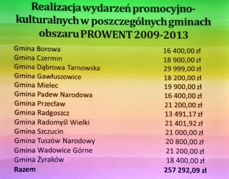 Przeprowadzony w czasie targów konkurs na najlepszą prezentację gminy skierowany był do instytucji kultury i gmin działających na rzecz promocji obszaru „PROWENT”, zajmujących się pielęgnowaniem tradycji oraz prowadzących, wspierających i organizujących działalność kulturalną. Jury oceniające sposób promocji poszczególnych gmin na stoiskach targów przedsiębiorczości miało bardzo trudne zadanie do wypełnienia, gdyż wszystkie gminy członkowskie LGD „PROWENT” prezentowały się wspaniale, doskonale wykorzystując swoje atuty kulinarne, artystyczne, a nawet wokalne. Oprócz Dąbrowy Tarnowskiej członkami LGD „PROWENT” są następujące gminy: Borowa, Czermin, Gawłuszowice, Mielec - gmina wiejska, Padew Narodowa, Przecław, Radomyśl Wielki, Radgoszcz, Szczucin, Tuszów Narodowy, Wadowice Górne, Żyraków. Gminy promujące swoje osiągnięcia w Woli Chorzelowskiej razem tworzyły barwny i tętniący pozytywną energią obszar ekspozycyjny, świadczący o ich ogromnym potencjale. Warto tutaj zaznaczyć, że wszystkie gminy korzystały ze wsparcia finansowego dla małych projektów ze środków pochodzących z Programu Rozwoju Obszarów Wiejskich, a dostępnych dzięki lokalnej strategii działania w ramach Stowarzyszenia „PROWENT”.