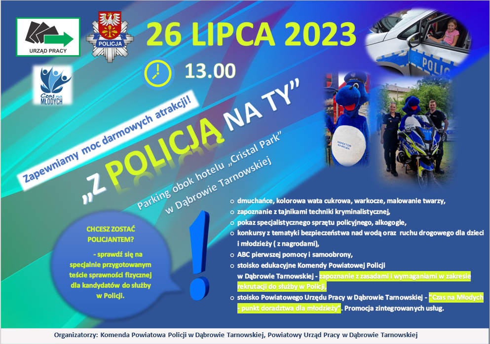 Z okazji nadchodzących Powiatowych Obchodów Święta Policji, nadkom. Jarosław Kmieć – Komendant Powiatowy Policji w Dąbrowie Tarnowskiej oraz Mariola Kobos – Dyrektor Powiatowego Urzędu Pracy, serdecznie zapraszają na piknik, pod hasłem Z POLICJĄ NA TY, który odbędzie się w dniu 26 lipca 2023 r. (środa), od godziny 13.00, na terenie parkingu miejskiego obok hotelu „Cristal Park" w Dąbrowie Tarnowskiej. Organizatorzy przewidują wiele atrakcji dla dzieci, młodzieży i dorosłych. Wydarzenie to, będzie również idealną okazją, by każdy mógł zapoznać się z wyposażeniem policyjnym oraz uzyskać informacje na temat służby w Policji. plakat piknik Piknik pod hasłem Z POLICJĄ NA TY