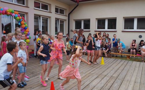 Po spektaklu czekała na wszystkich wspaniała rozrywka z animatorkami oraz poczęstunek przygotowany przez rodziców. Atrakcji było co niemiara! Tańce, mnóstwo konkursów dla dzieci i dorosłych, malowanie twarzy, łapanie baniek mydlanych, loteria fantowa – każdy mógł znaleźć coś dla siebie. Szczególnym powodzeniem cieszyła się fotobudka, dzięki której powstało wiele zwariowanych, kolorowych, szalonych i pamiątkowych zdjęć. Mocno oblegane było również stanowisko z knoockerem, gdzie mali i duzi mogli poćwiczyć zręczność i spostrzegawczość.
