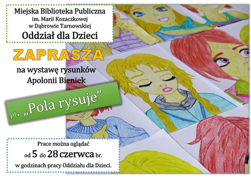 Oddział dla Dzieci Miejskiej Biblioteki Publicznej im. Marii Kozaczkowej w Dąbrowie Tarnowskiej zaprasza na wystawę rysunków Apolonii Bieniek – wieloletniej czytelniczki naszej książnicy. Ekspozycja prac pt. „Pola rysuje” będzie dostępna od 5 do 28 czerwca br. w oddziale w godzinach jego pracy. Apolonia Bieniek jest 27-letnią posiadaczką artystycznej duszy. Swoją przygodę z rysowaniem zaczęła około 20 roku życia, a obecnie jej zbiór liczy ponad 170 prac. W jej kolekcji znajdują się malunki postaci z komiksów, książek, filmów, bajek oraz ulubionych artystów. Jak sama przyznaje, najbardziej lubi rysować portrety.  Jej narzędziami do pracy głównie są ołówek i kredki, czasami sięga też po kolorowe pisaki. Na wystawie jej prac można zobaczyć np. Garfielda, Annę i Elsę z „Krainy Lodu”, Reksia, mieszkańców Stumilowego Lasu czy bohaterów z serii komiksów „W.I.T.C.H.”.