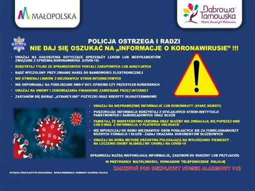 Policja radzi korzystać tylko ze sprawdzonych portali sprzedażowych, nie otwierać linków z nieznanych stron internetowych, nie odpowiadać na podejrzane sms-y, dotyczące epidemii lub przesyłek kurierskich i zachować czujność przy zmianie hasła do bankowości internetowej. Należy zwrócić szczególną uwagę na umowy i zobowiązania zawierane przez internet szczególnie korzystania z „atrakcyjnych pożyczek” czy kredytów długoterminowych. – Ministerstwo Zdrowia i inne służby nie zwracają się przez sms-y lub emaile z informacją o płatnych usługach. Uważajmy na nową metodę wyłudzania pieniędzy dla bliskiej nam osoby rzekomo chorej na koronawirusa lub przebywającej na kwarantannie – ostrzega rzecznik KWP Sebastian Gleń.