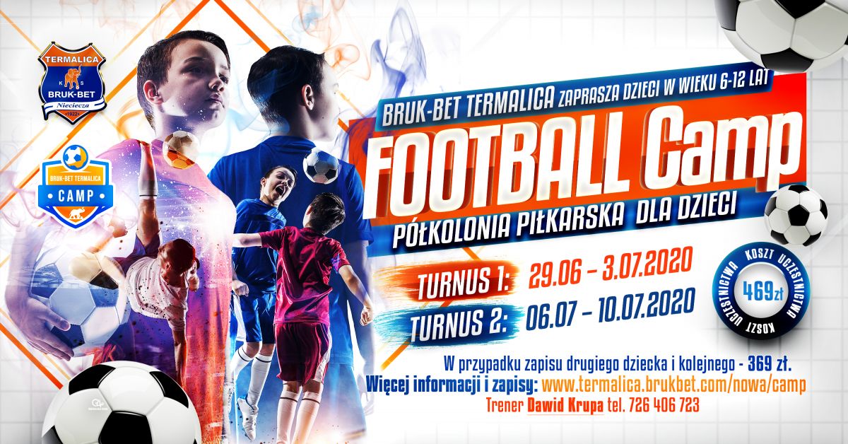 Na prośbę klubu Bruk-Bet Termalica Nieciecza informujemy, że przygotował on specjalną sportową półkolonie, która jest idealną, wakacyjną propozycja dla wszystkich kochających piłkę nożną. Bruk-Bet Termalica Football Camp to wyjątkowa półkolonia piłkarska.  Z myślą o ambitnych młodych zawodnikach, którzy chcą przyspieszyć rozwój umiejętności i wiedzy piłkarskiej, Półkolonia Bruk-Bet Termalica Football Camp skierowana jest do wszystkich dzieci w wieku 2013 – 2007 lat chcących przeżyć sportową przygodę. Zapraszamy również dzieci nie trenujące w drużynach młodzieżowych Słoni ! Uczestnicy są pod stałą opieką trenerów Akademii Bruk-Bet Termalica Nieciecza, zarówno w trakcie treningów, jak i w przerwach na regenerację i lunch. Każdy uczestnik treningu objęty jest ubezpieczeniem NNW.