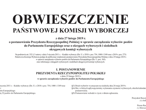 Obwieszczenie Państwowej Komisji Wyborczej z dnia 27 lutego 2019 r. o postanowieniu Prezydenta Rzeczypospolitej Polskiej z dnia 25 lutego 2019 r. w sprawie zarządzenia wyborów posłów do Parlamentu Europejskiego oraz o okręgach wyborczych i siedzibach okręgowych komisji wyborczych. Obwieszczenie wybory do europarlamentu 2019pop Obwieszczenie PKW o postanowieniu Prezydenta Rzeczypospolitej Polskiej w sprawie zarządzenia wyborów posłów do Parlamentu Europejskiego