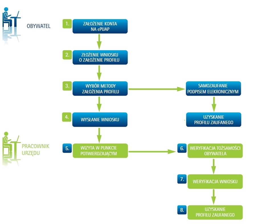Należy najpierw założyć konto użytkownika na portalu ePUAP (www.epuap.gov.pl), z którego wysyłamy wniosek o potwierdzenie profilu zaufanego. Następnym krokiem jest uwierzytelnienie Profilu w jednym z urzędów (czyli trzeba się będzie jedyny raz udać się do odpowiedniego punktu) – ich lista jest dostępna w systemie ePUAP. W wybranym urzędzie dokumentujemy przed urzędnikiem swoje dane osobowe, który porównuje je z wprowadzonymi do systemu. Po pozytywnej weryfikacji danych, na podstawie przedłożonego dowodu osobistego, konto założone na portalu ePUAP zyskuje status profilu zaufanego.